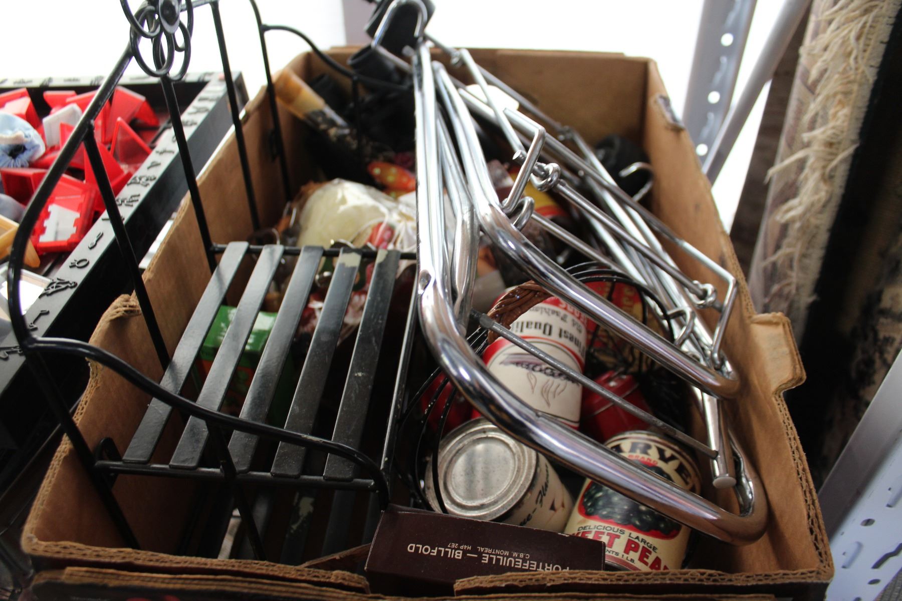 BOX OF DECORATIVE KITCHEN ITEMS BINOCULARS AND TINS