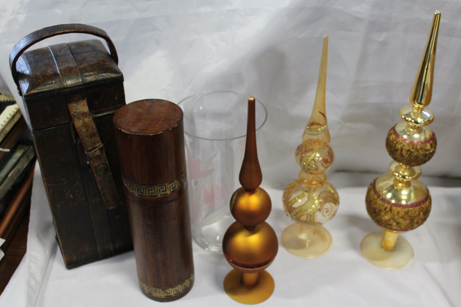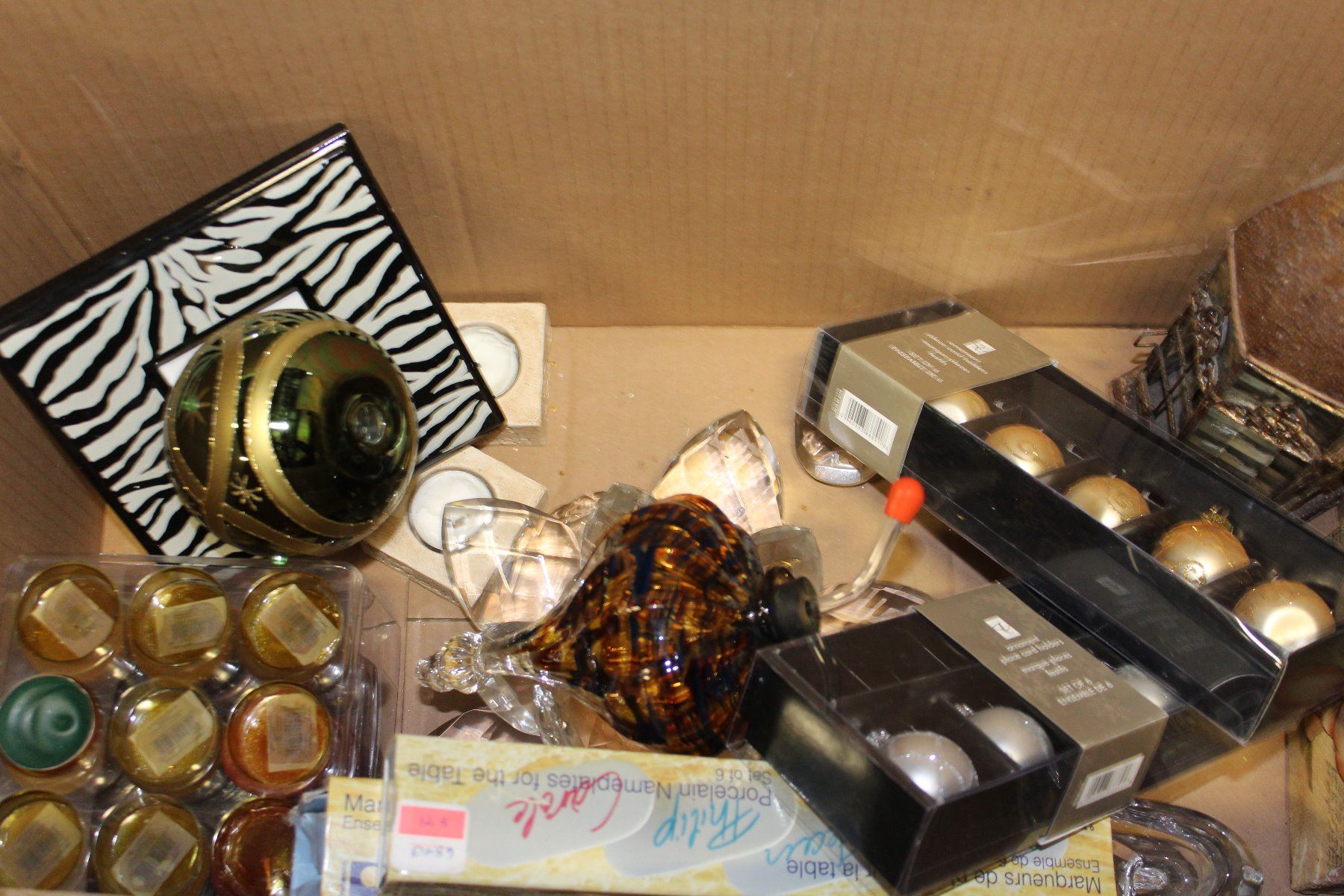 BOX OF DECORATIVE WINE HOLDERS TEALIGHT HOLDERS AND GLASS DECORATIONS