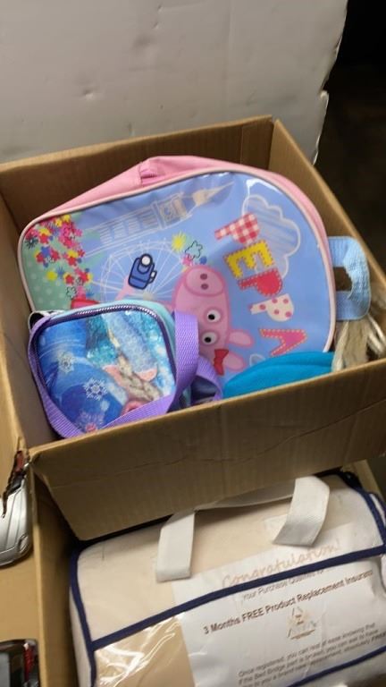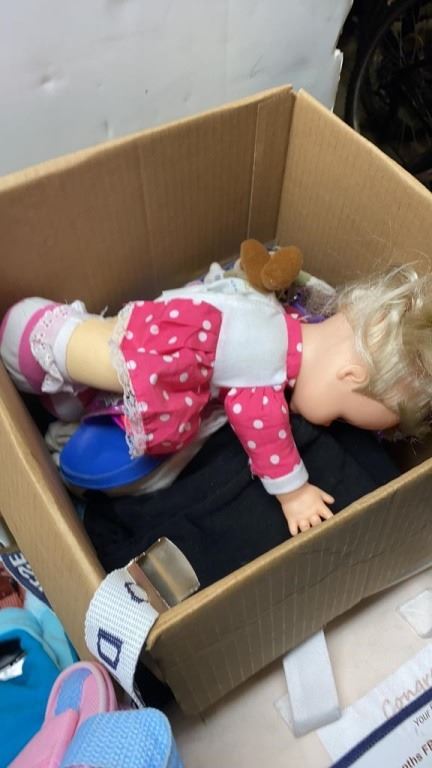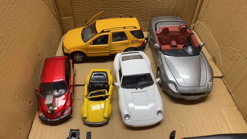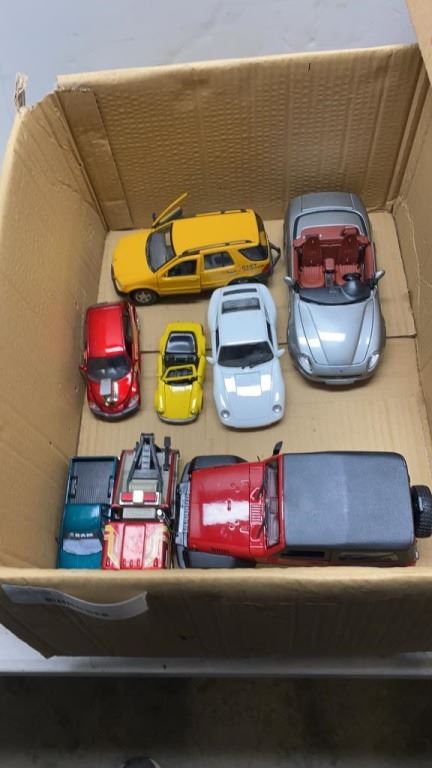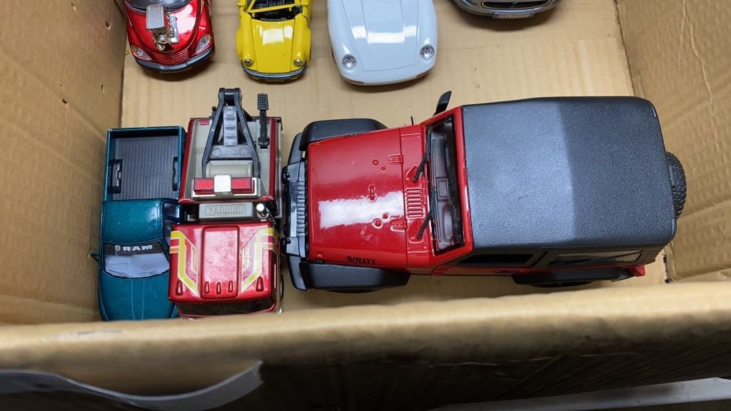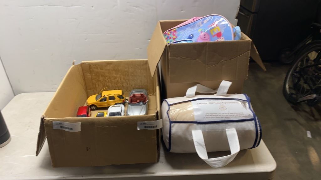 BOX OF DIE CAST VEHICLES AND BOX OF KIDS BACK, PLAY SHOES AND MORE