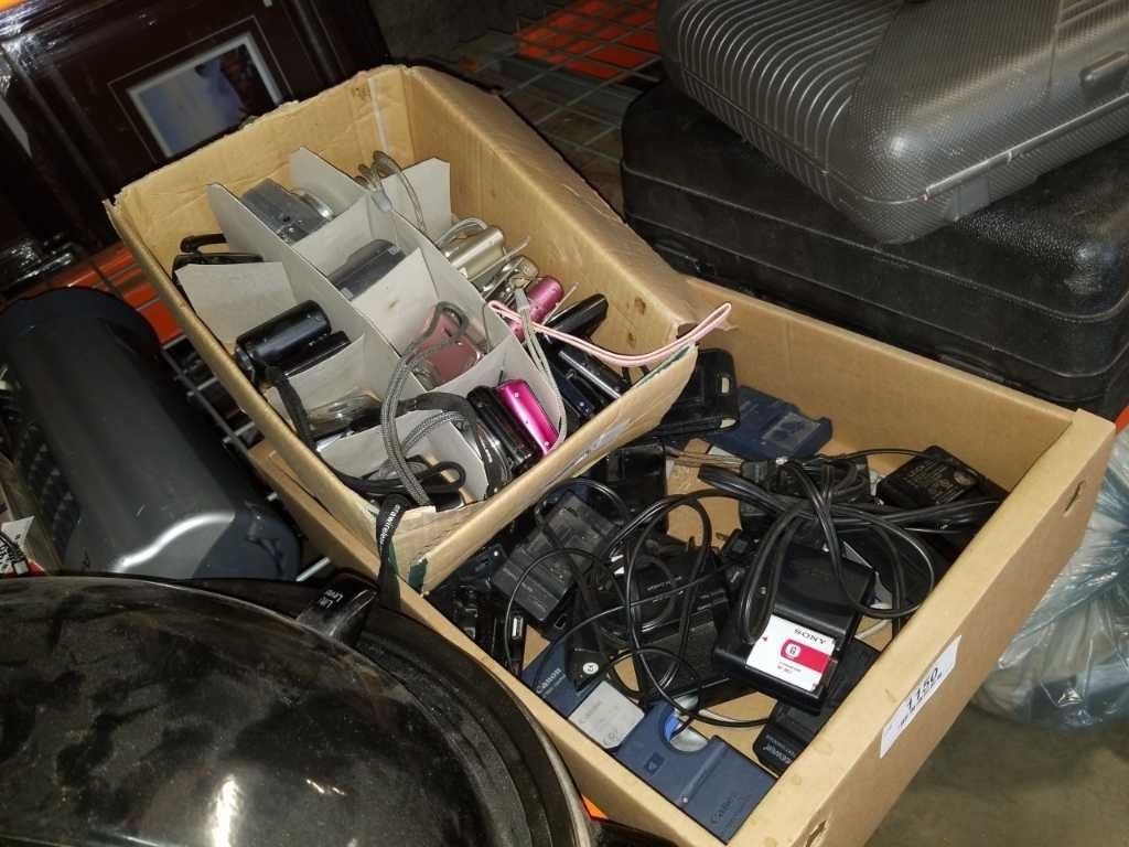 BOX OF DIGITAL CAMERAS AND WOOD BOX OF DIGITAL CAMERA BATTERY CHARGERS IPHONE DOCK SPEAKER SYSTEM