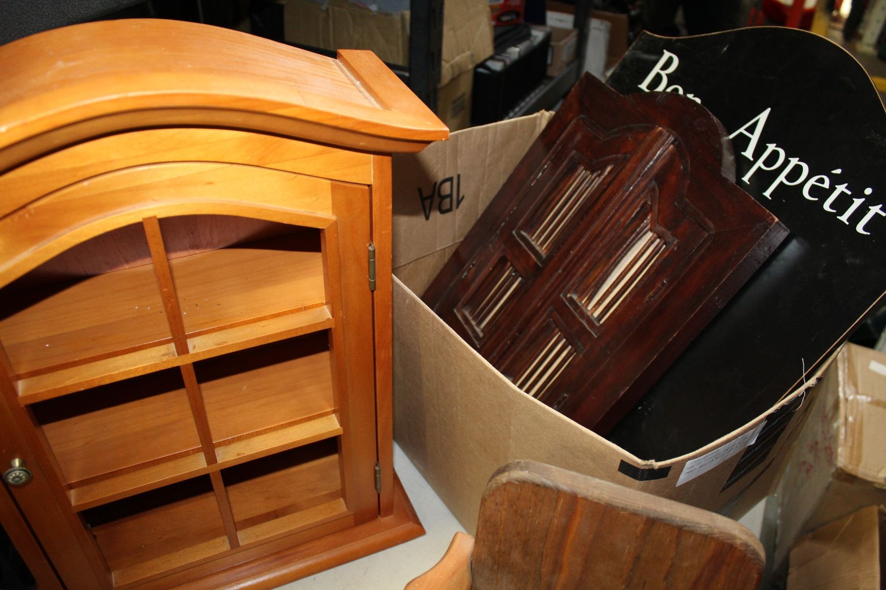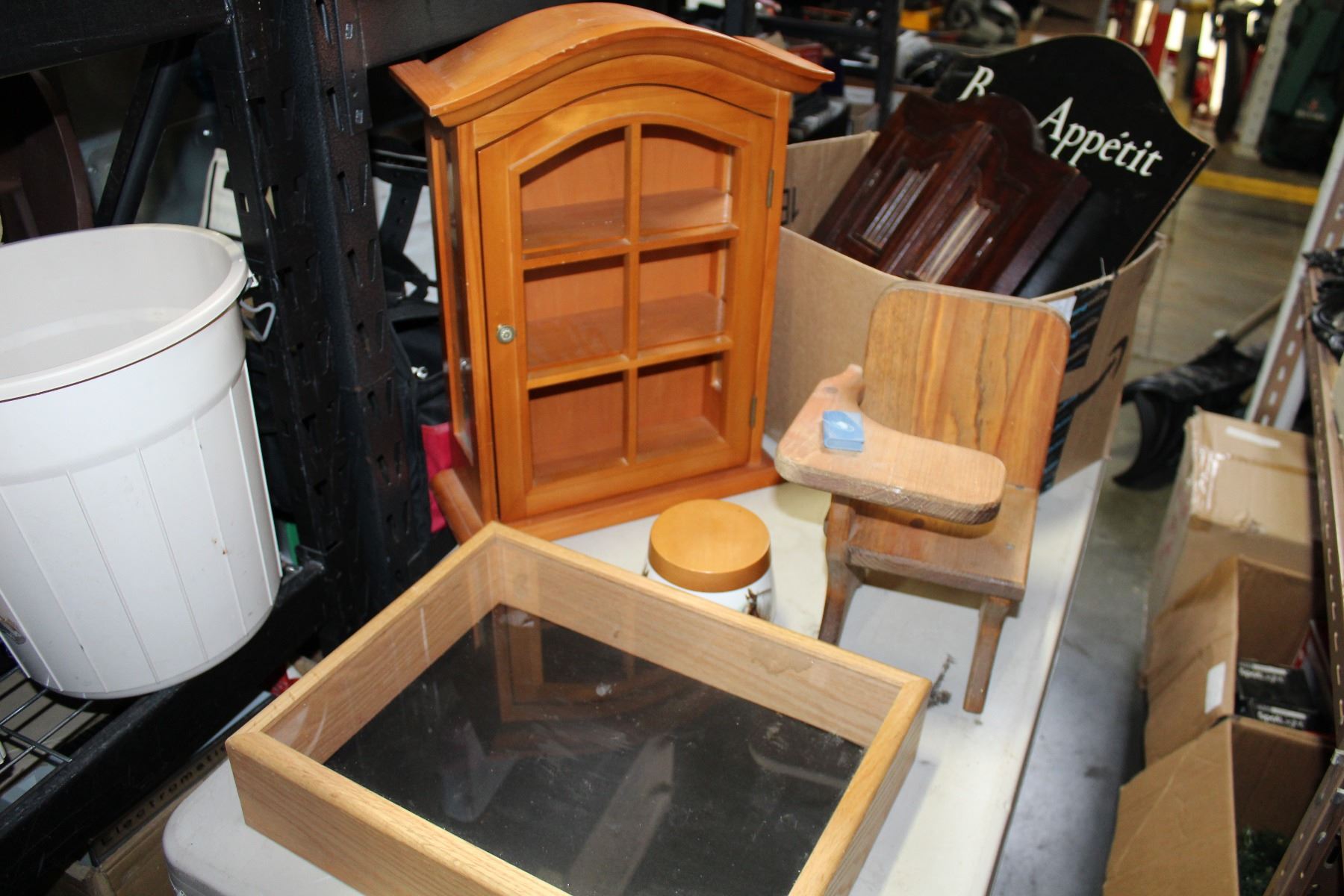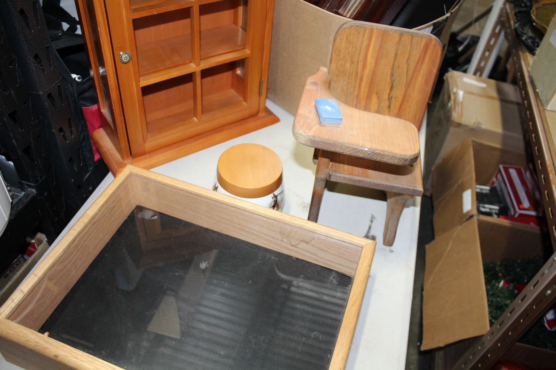 BOX OF DISPLAY CABINETS AND SMALL RELICA WOOD CHAIR ETC