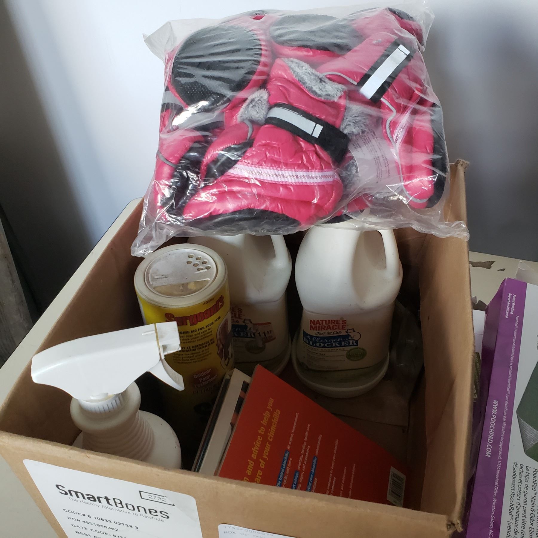 BOX OF DOG ITEMS, COAT, SPRAYS