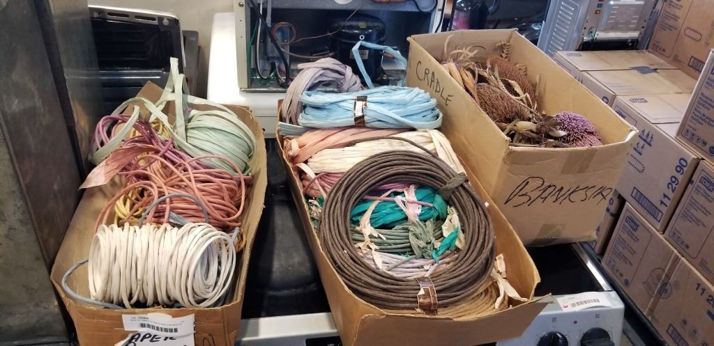 BOX OF DRIED FLORALS AND 2 BOXES OF PAPER RIBBON