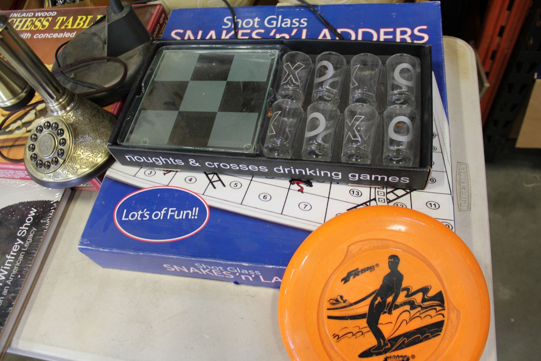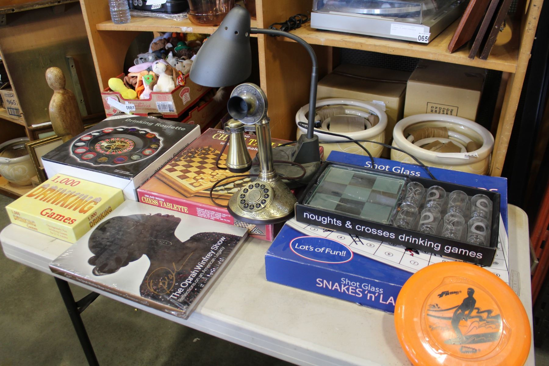 BOX OF DRINKING GAMES, TABLE LAMP, AND PHONE