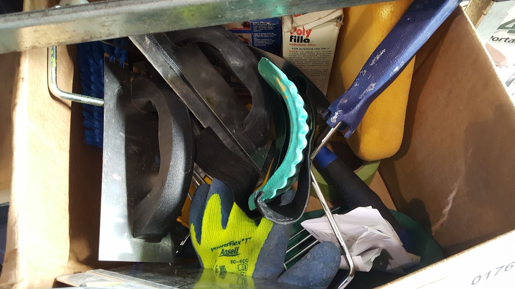 BOX OF DRYWALL TOOLS AND KNEEPADS
