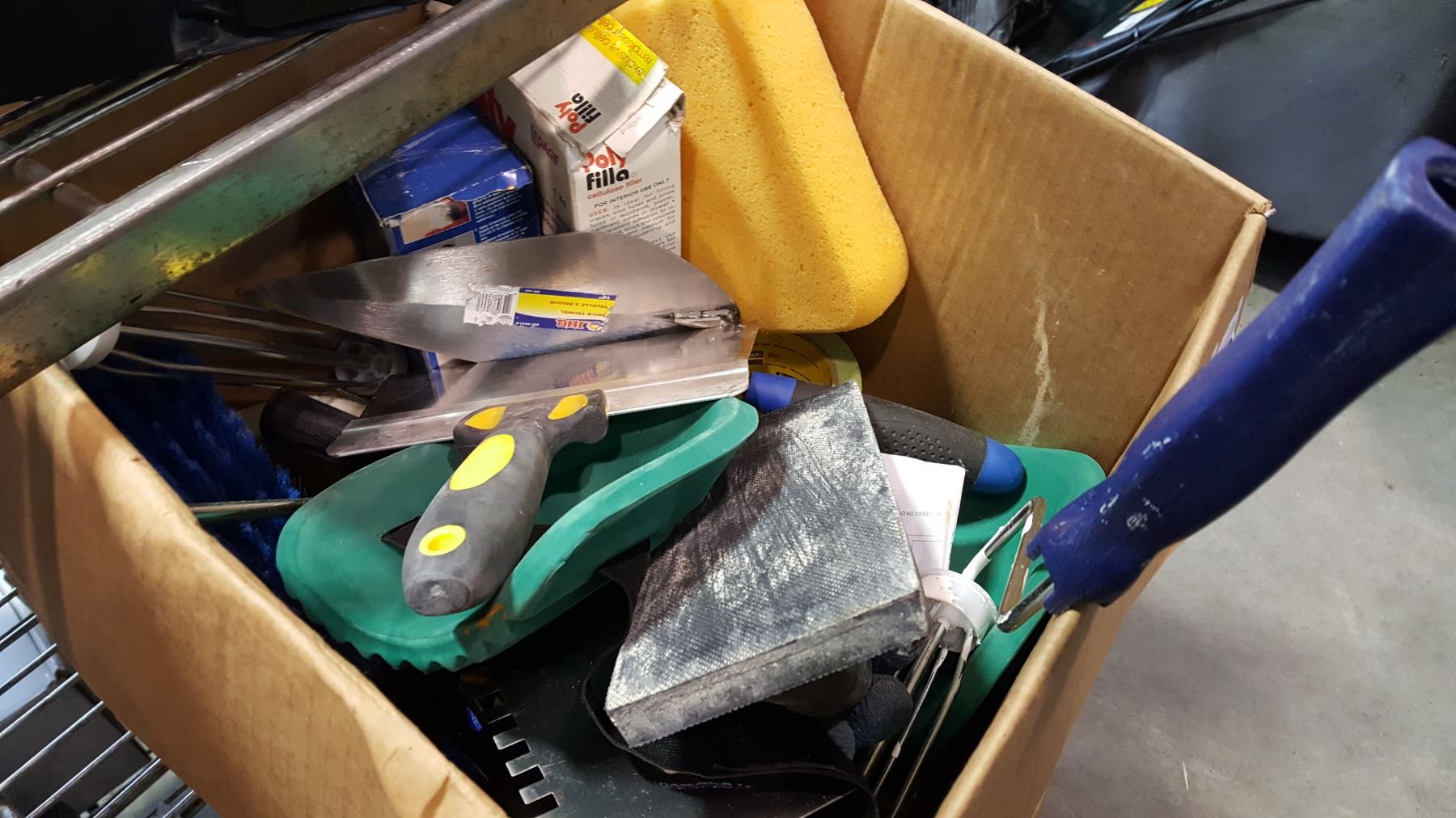 BOX OF DRYWALL TOOLS AND KNEEPADS