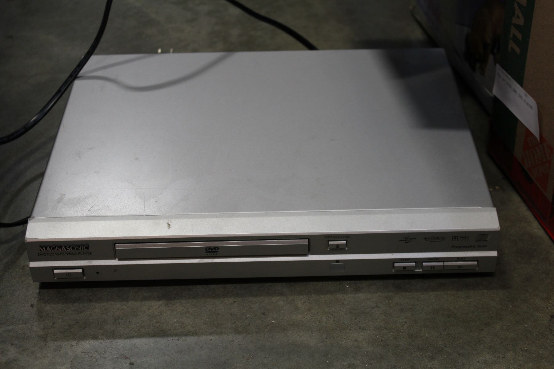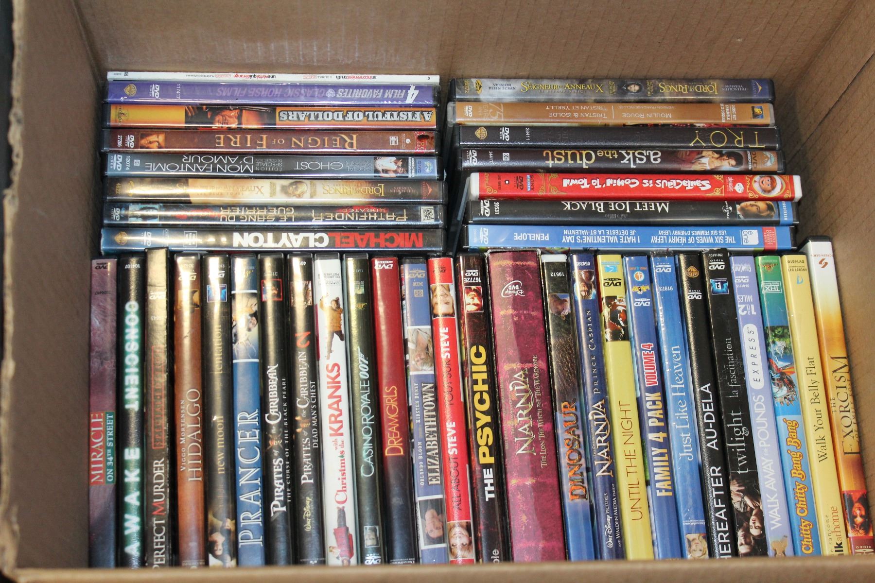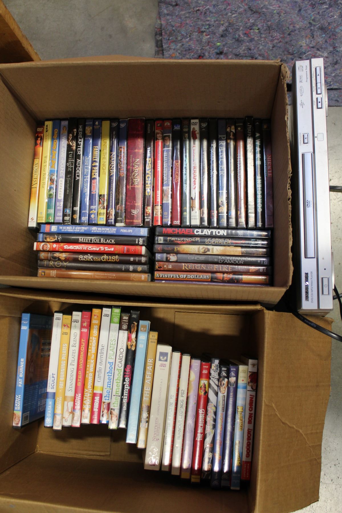 BOX OF DVDS AND DVD PLAYER