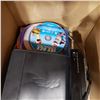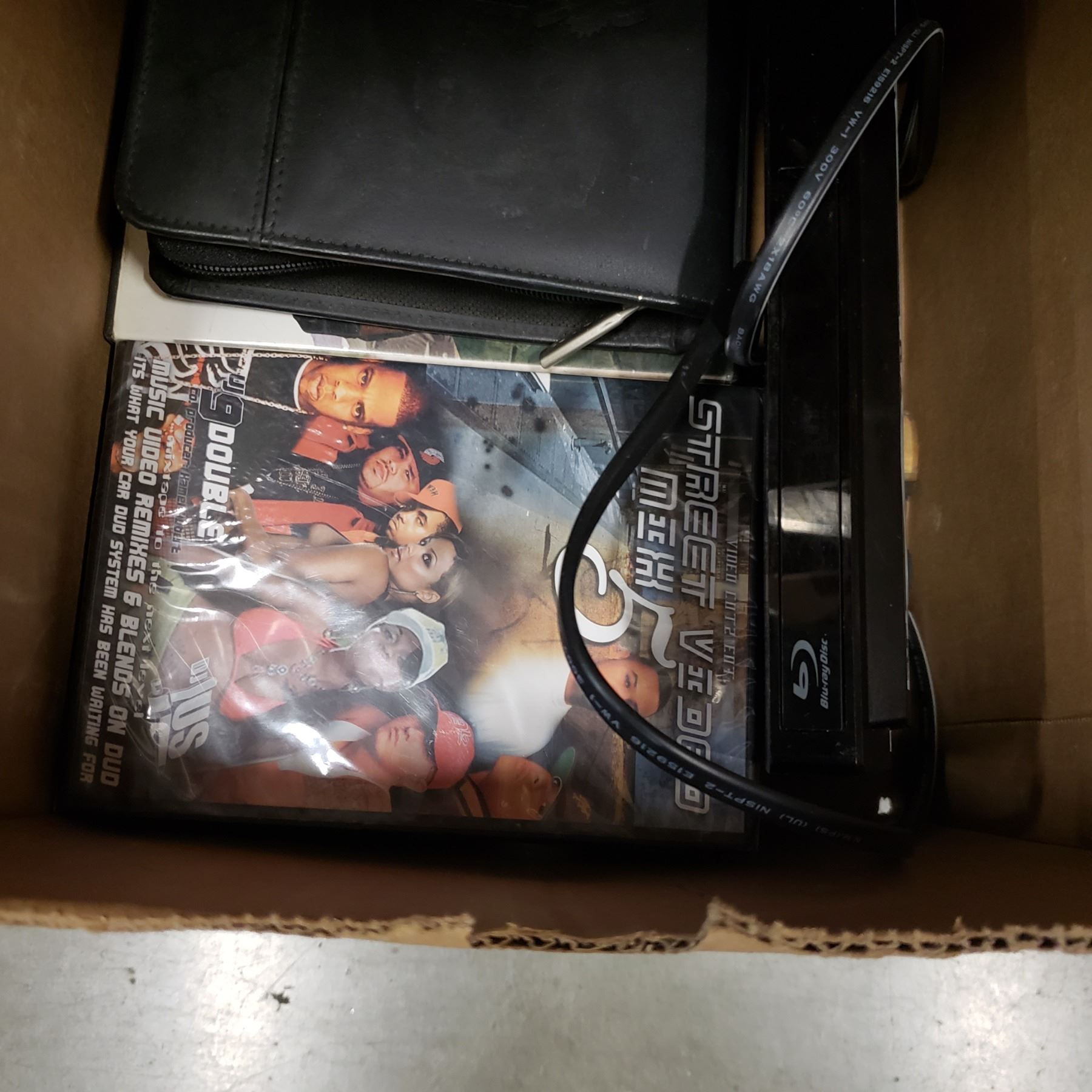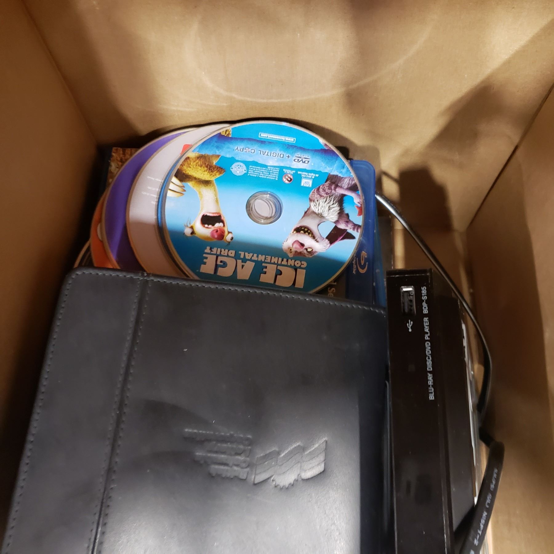 BOX OF DVDS, BLU RAYS, AND BLU RAY PLAYER