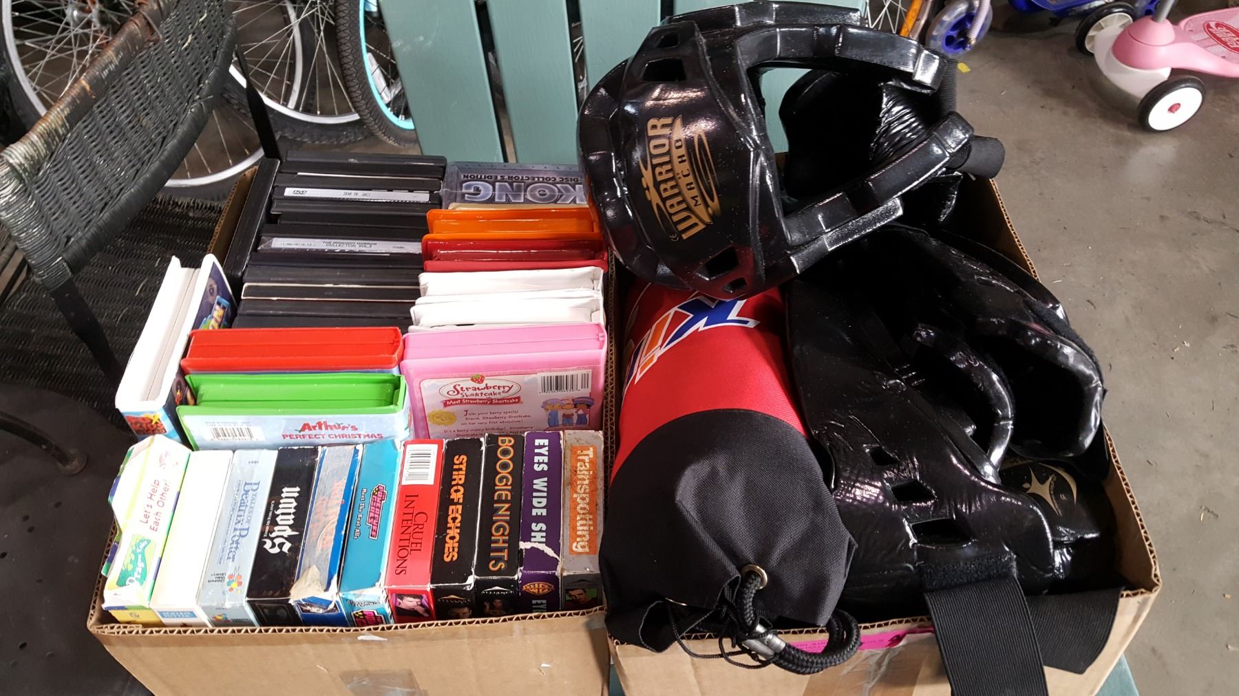 BOX OF DVDS, KIDS MOVIES, AND BOX OF MARTIAL ARTS PADS