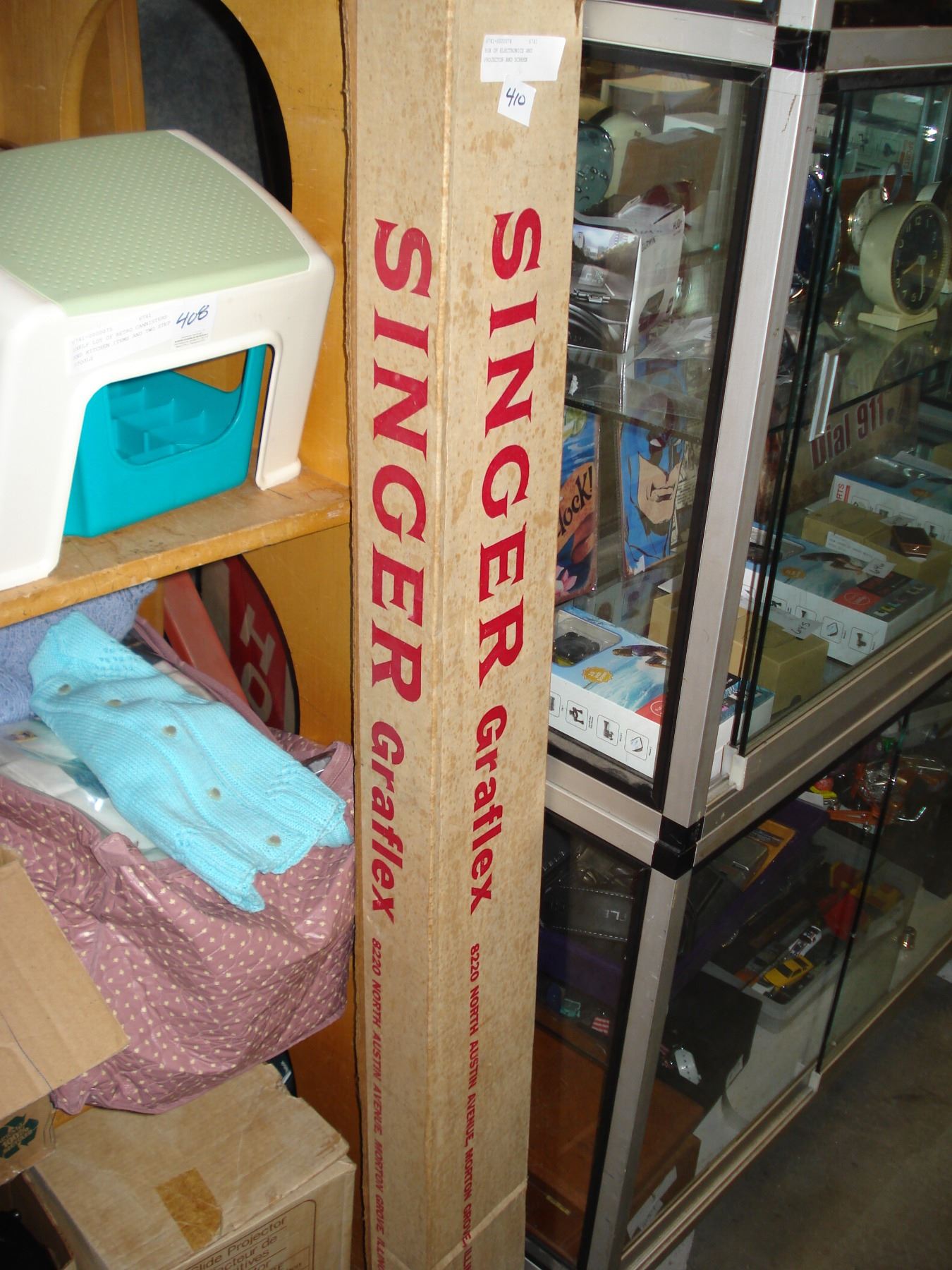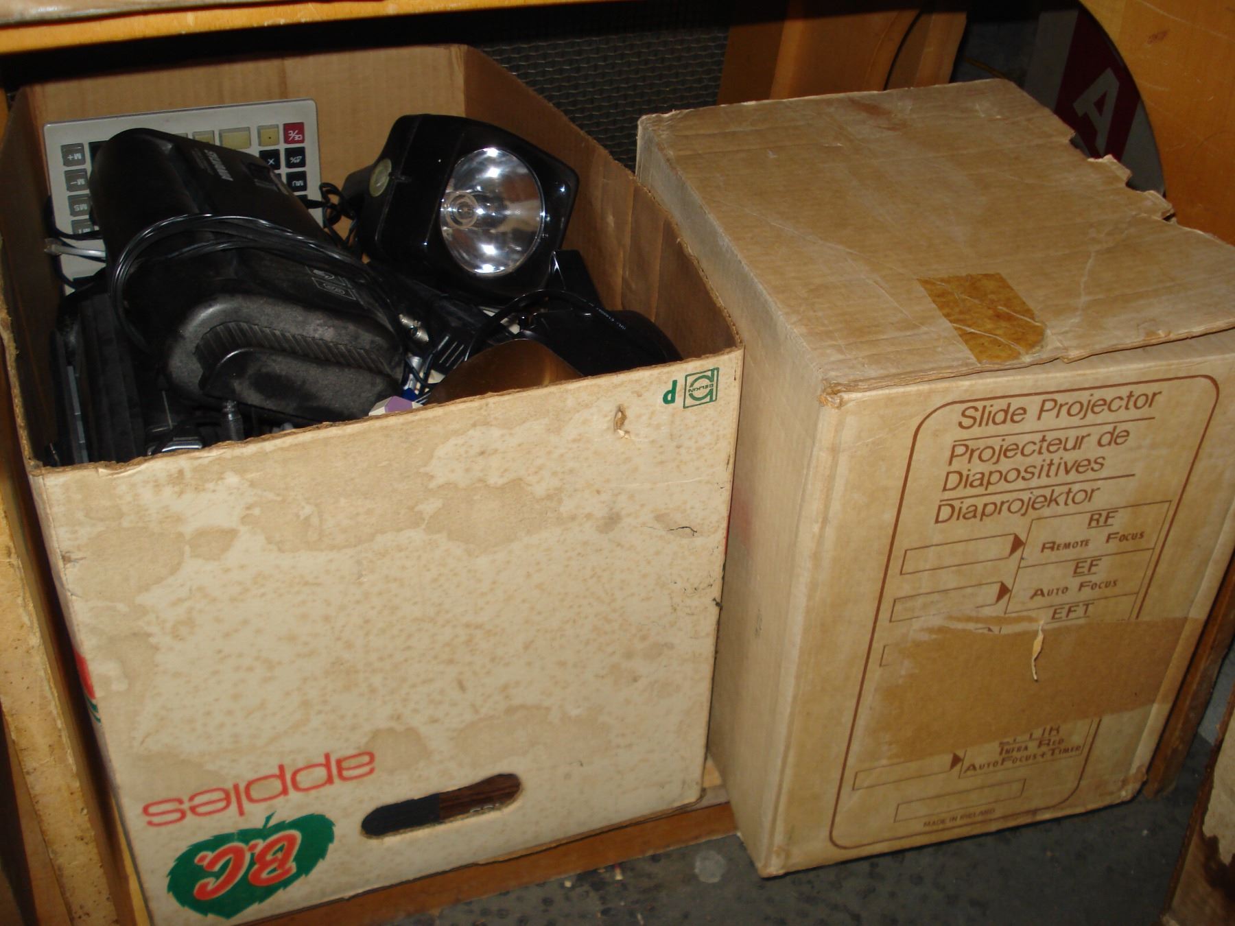 BOX OF ELECTRONICS AND PROJECTOR AND SCREEN