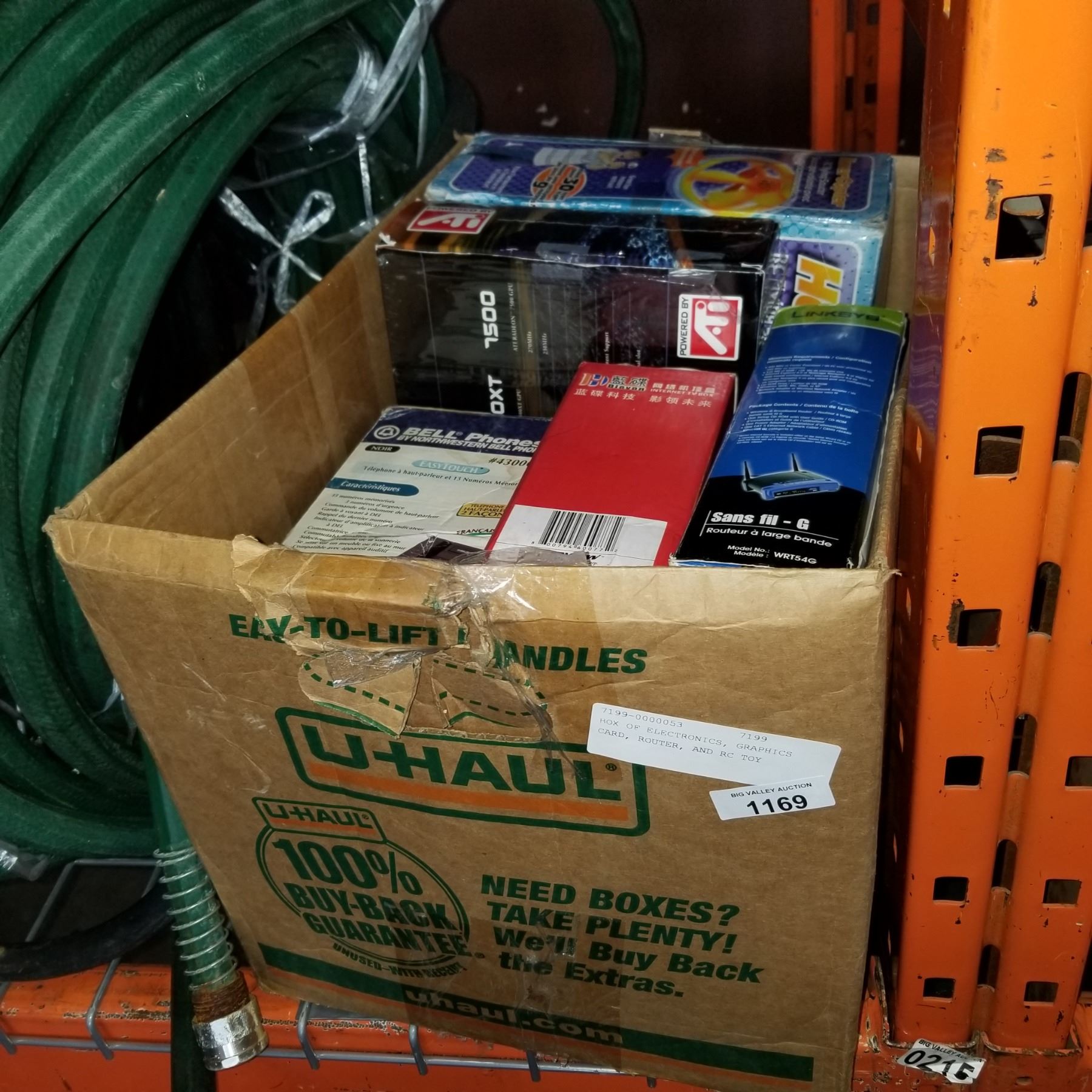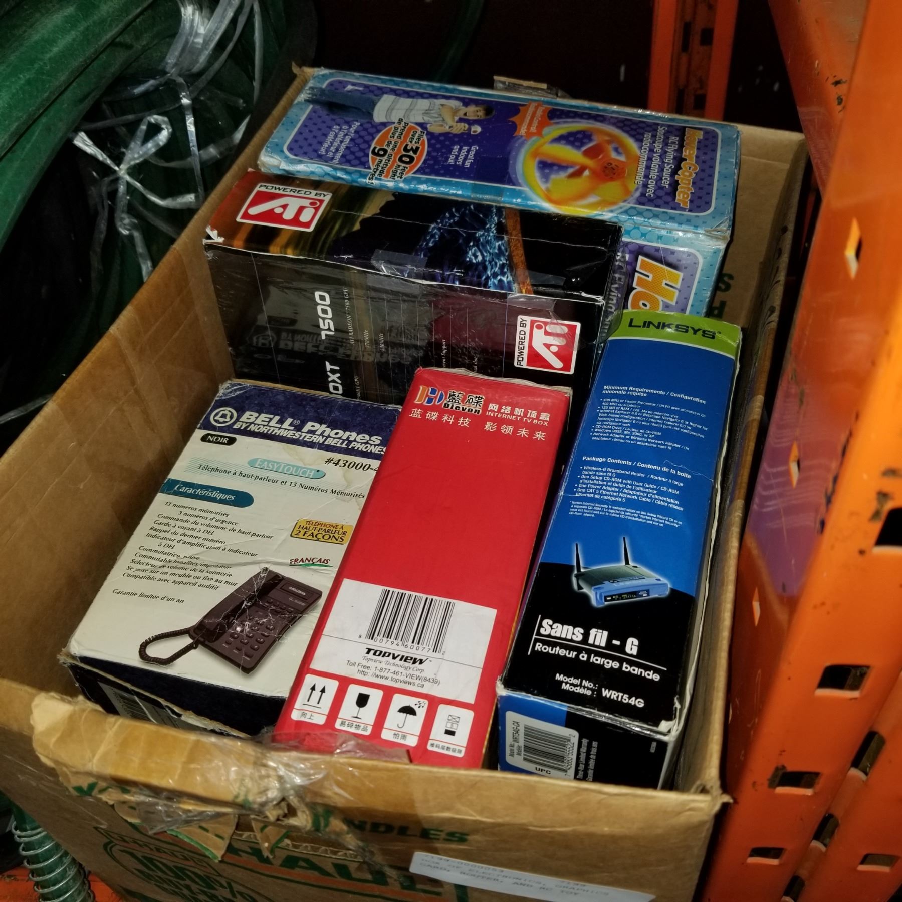 BOX OF ELECTRONICS, GRAPHICS CARD, ROUTER, AND RC TOY