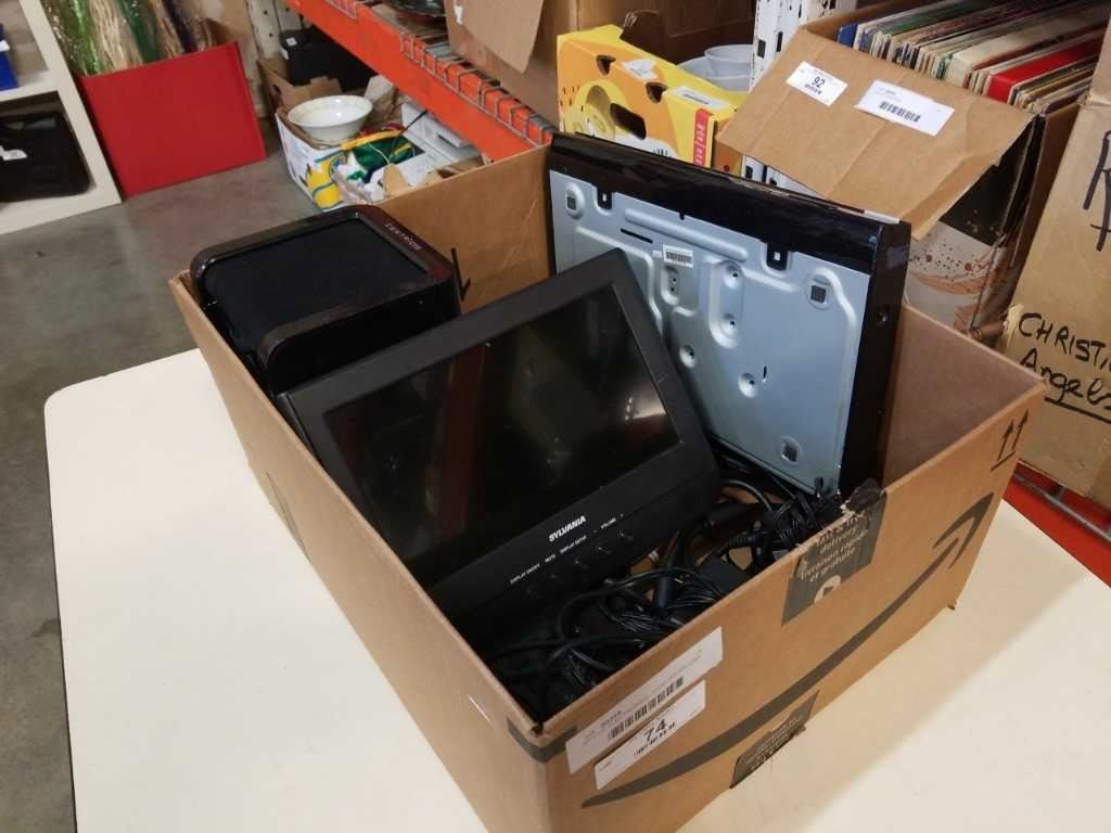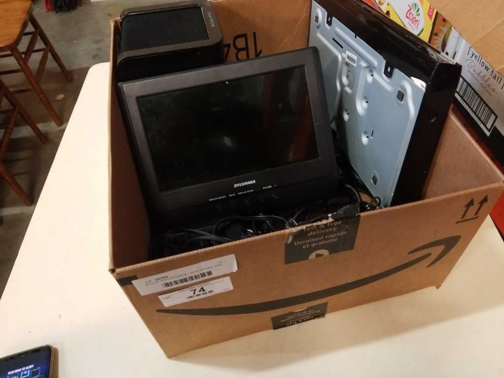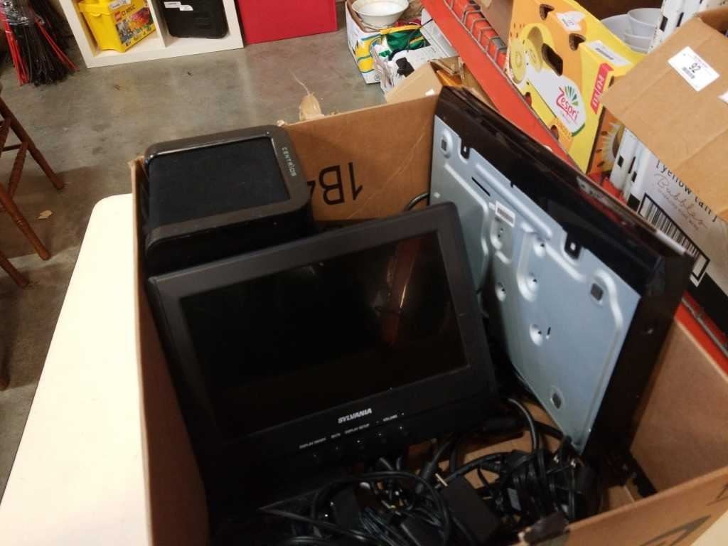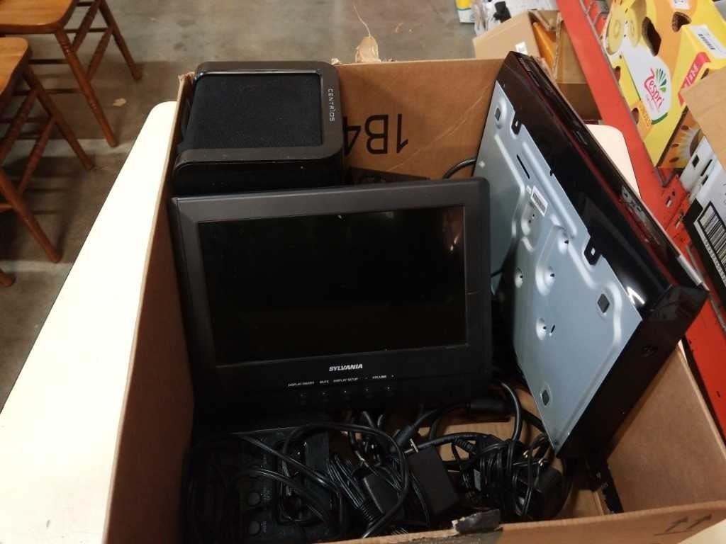 BOX OF ELECTRONICS - IPOD DOCKS, DVD PLAYER, DISPLAY SCREEN