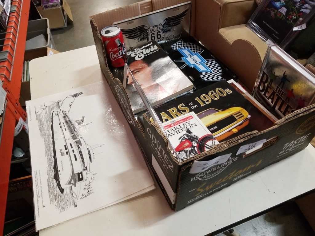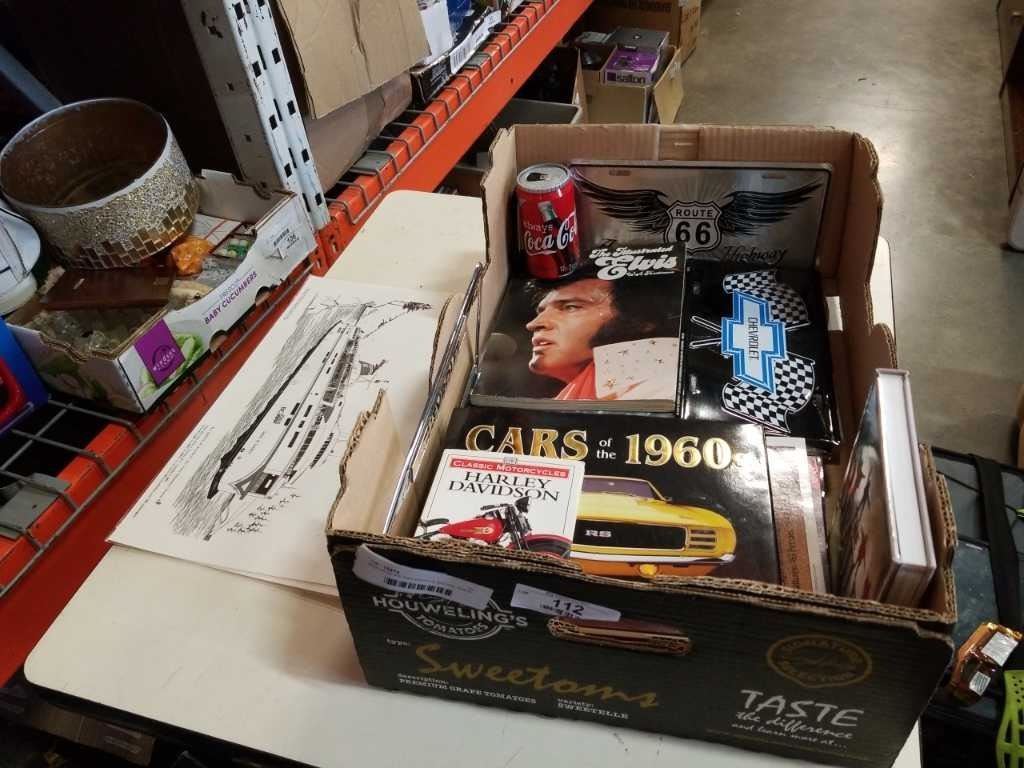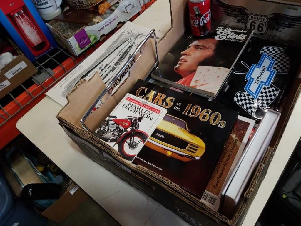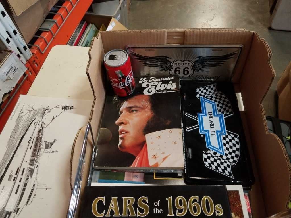 BOX OF ELVIS AND VEHICLE BOOKS, COCA COLA CAMERA