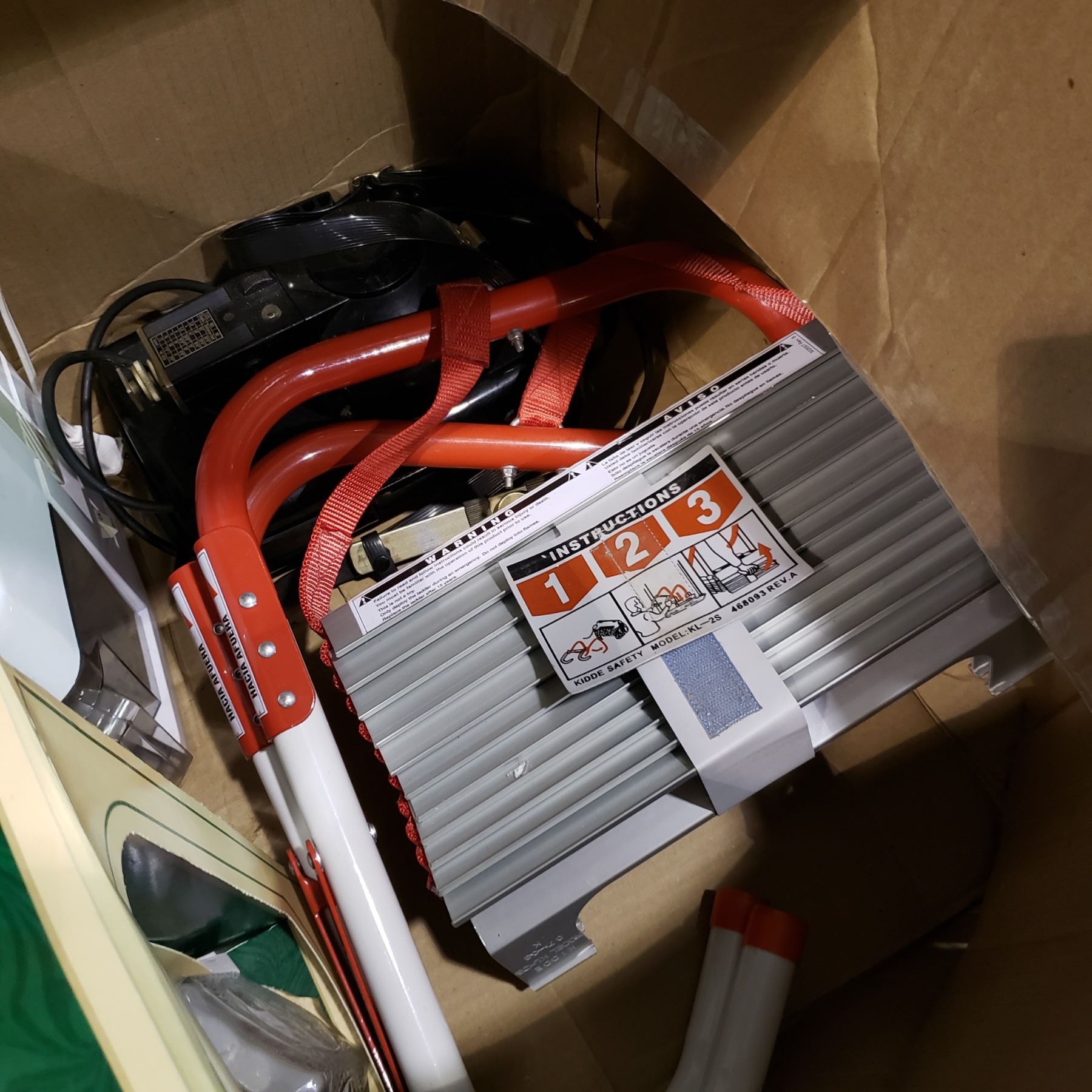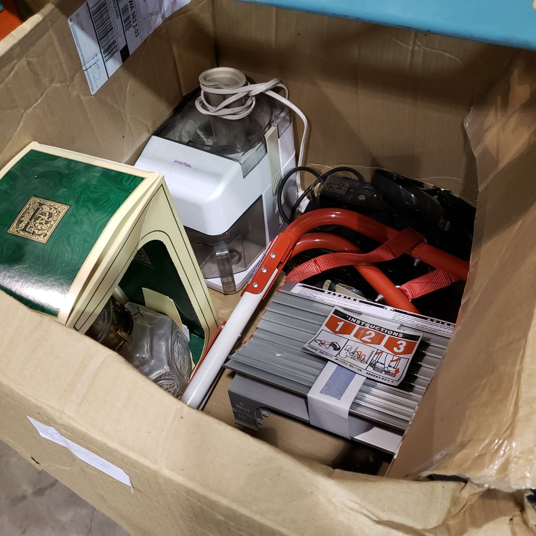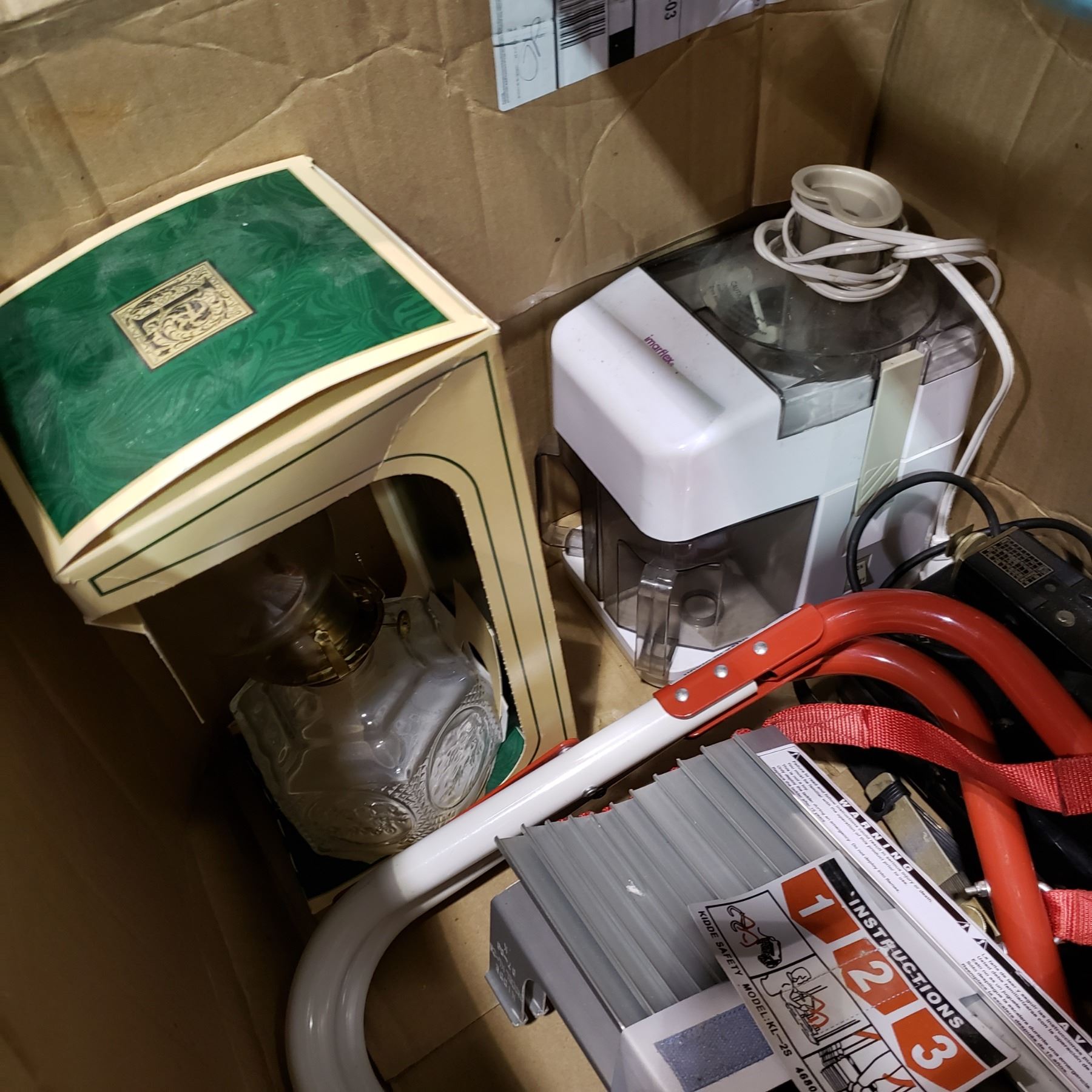 BOX OF EMERGENCY FIRE LADDER, VINTAGE SPOTLIGHT, OIL LAMP, AND JUICER