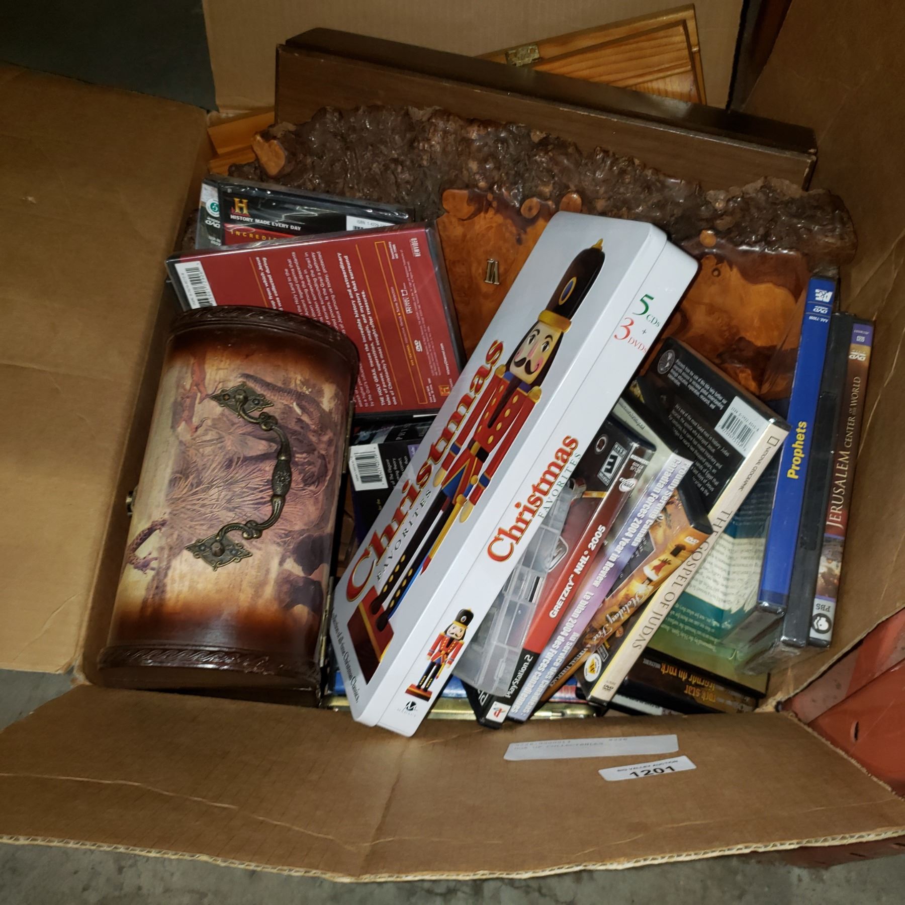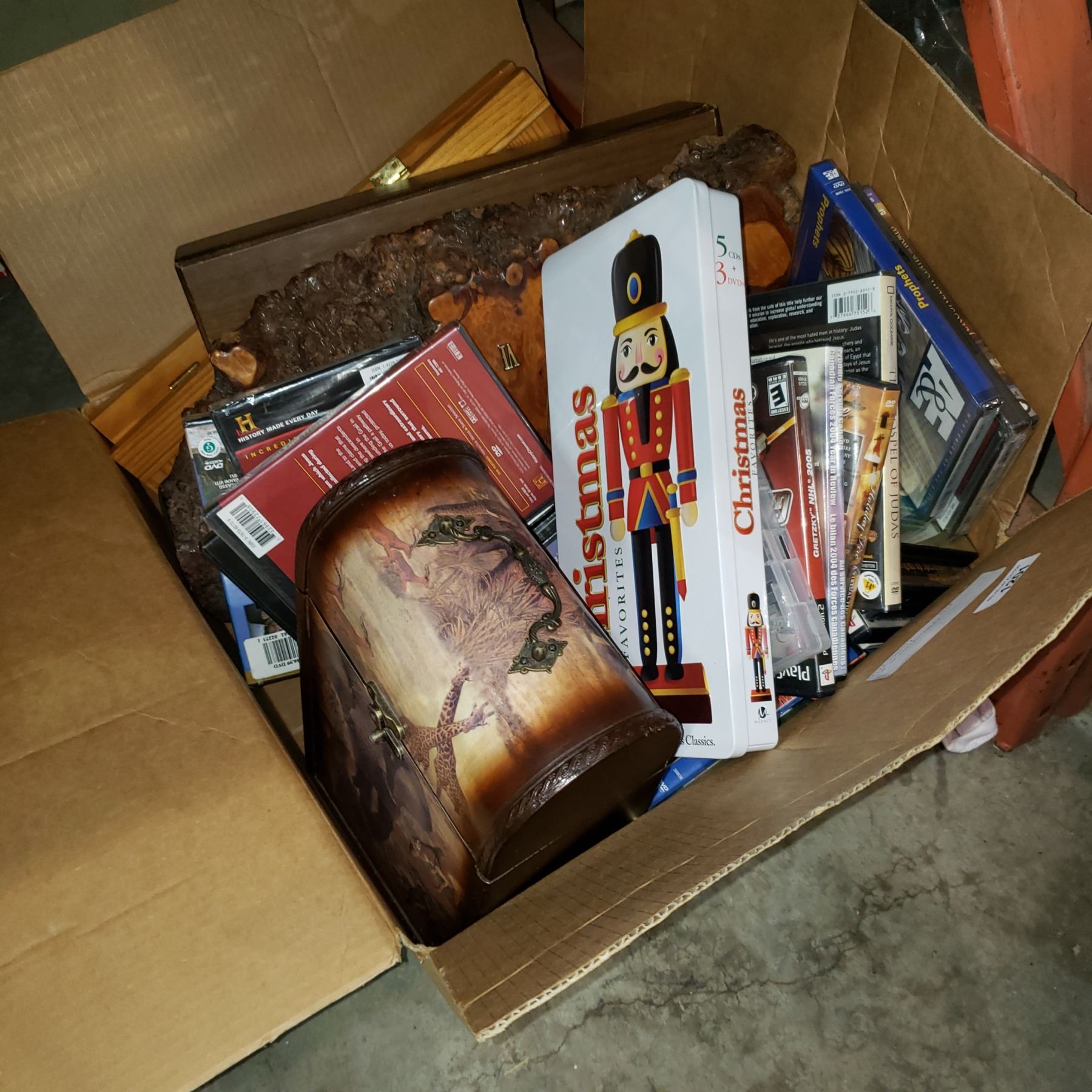 BOX OF ESTATE GOODS, DVDS, BURL CLOCK