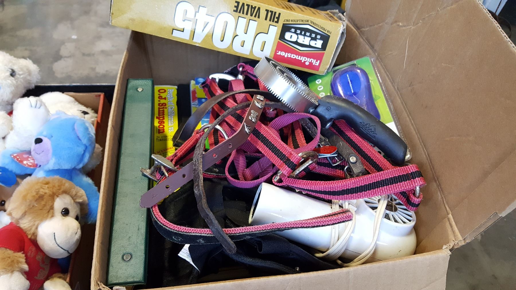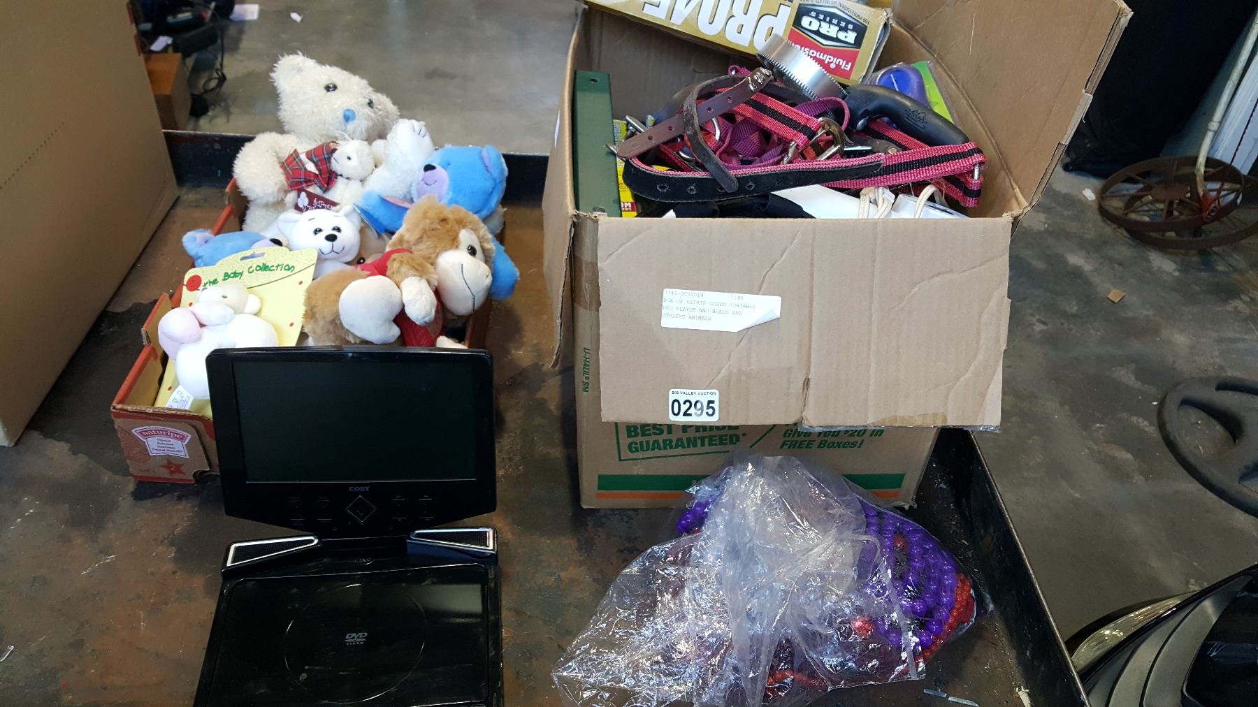 BOX OF ESTATE GOODS PORTABLE DVD PLAYER AND BEADS AND STUFFED ANIMALS