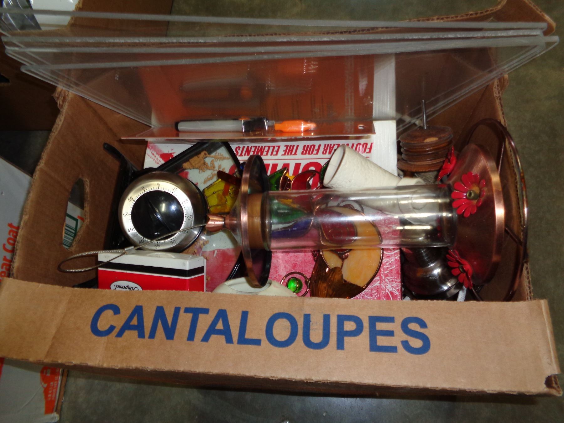 BOX OF ESTATE ITEMS IN CANTELOPE BOX