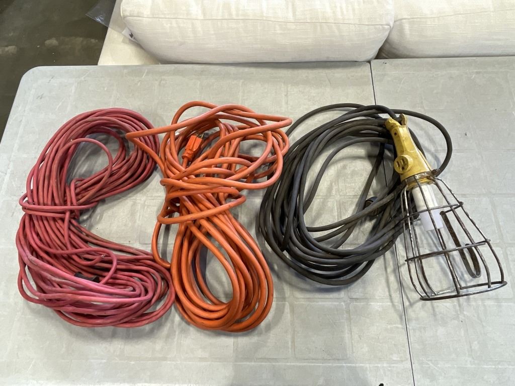 BOX OF EXTENSION CORDS AND SHOP LIGHT