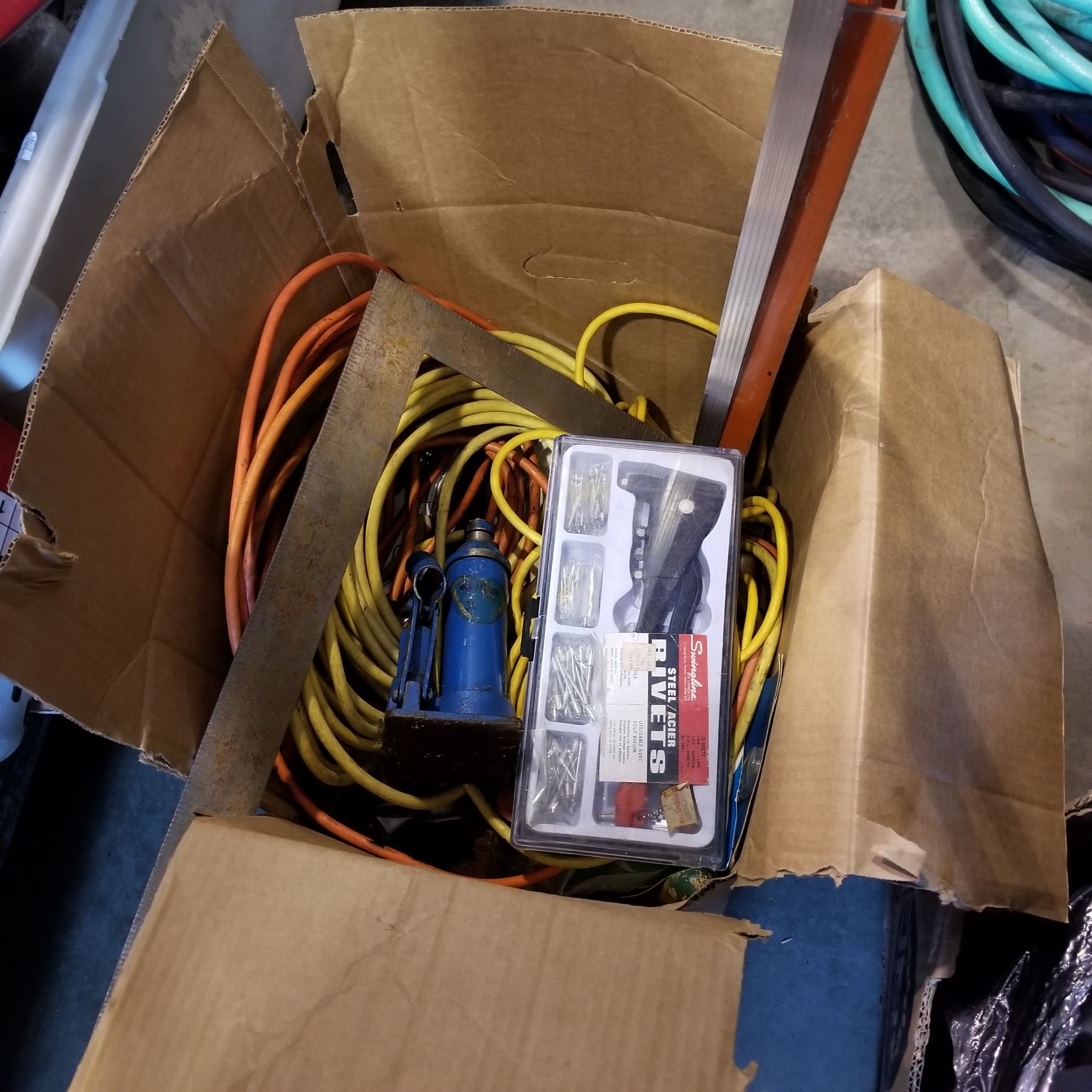 BOX OF EXTENSION CORDS, TOOL AND DRILL
