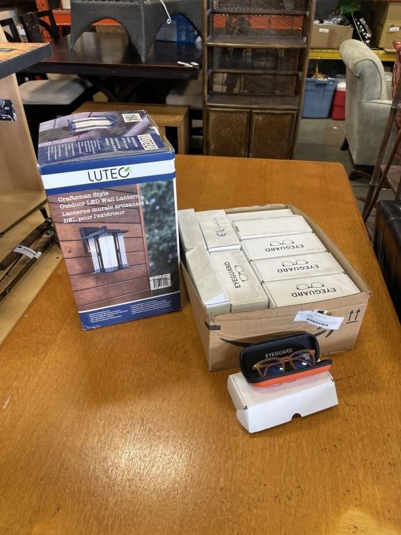 BOX OF EYEGLASS CASES AND EXTERIOR LIGHT FIXTURE