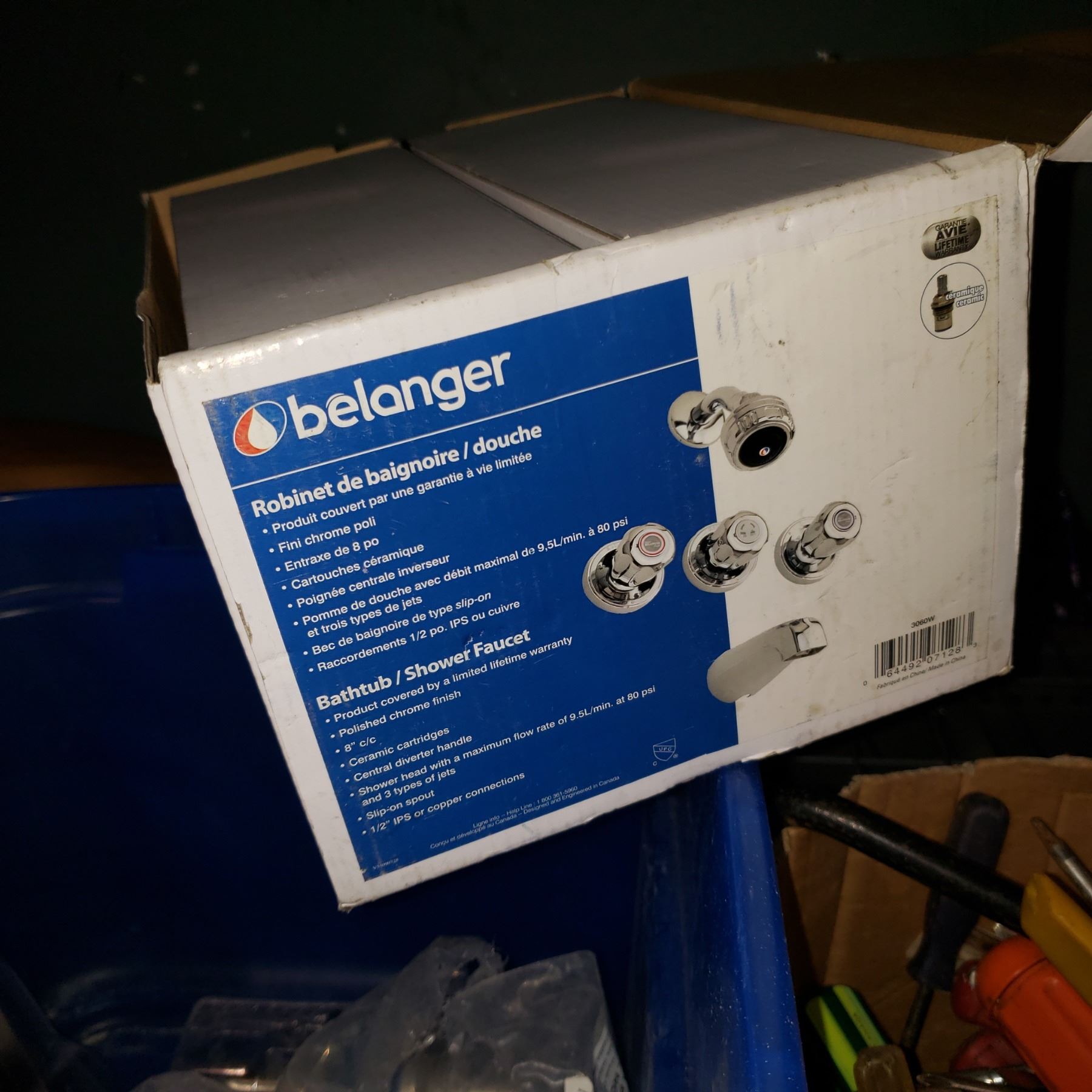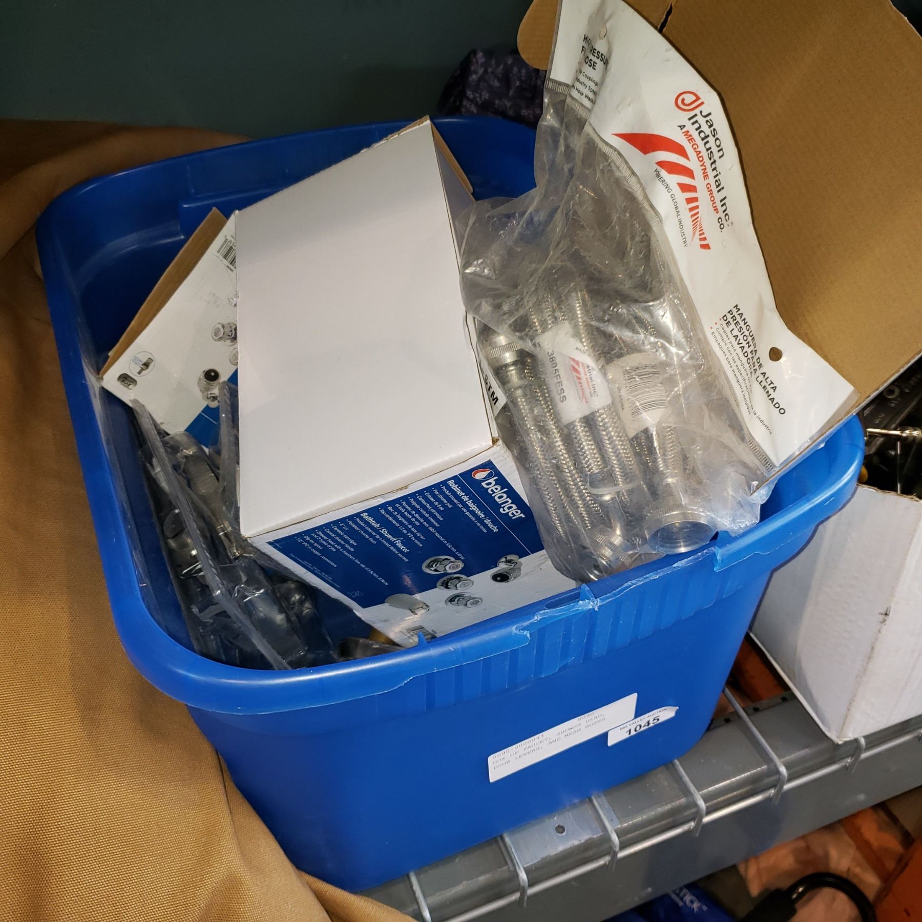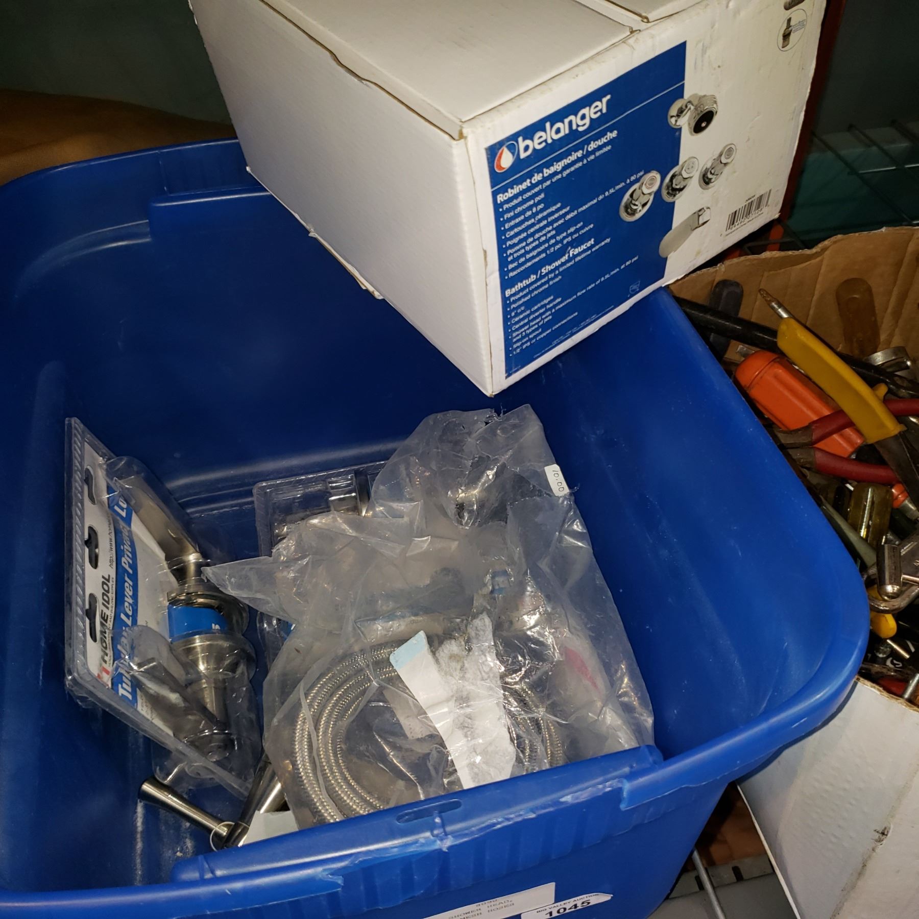 BOX OF FAUCET, SHOWER HEAD, DOOR LEVERS, AND MESH HOSES