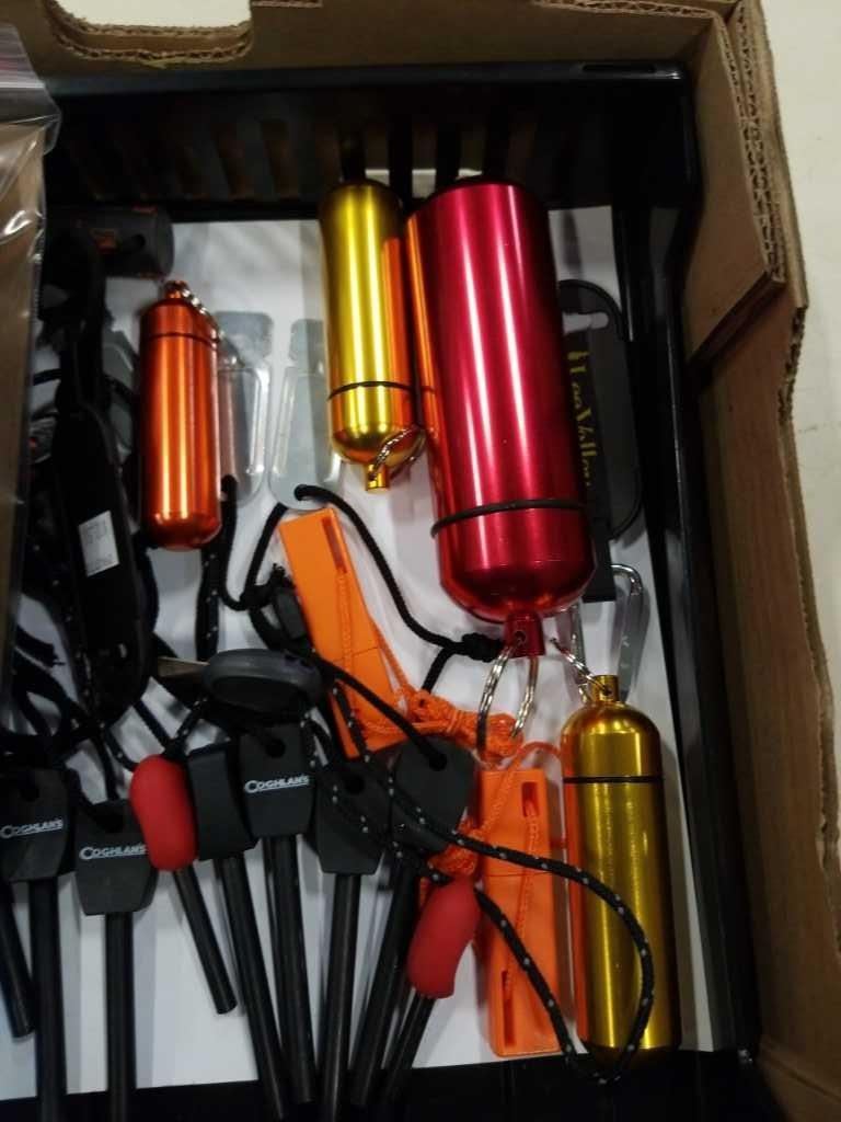 BOX OF FERRO ROD STARTER KITS, MAGNESIUM STARTERS AND WATERPROOF CONTAINERS