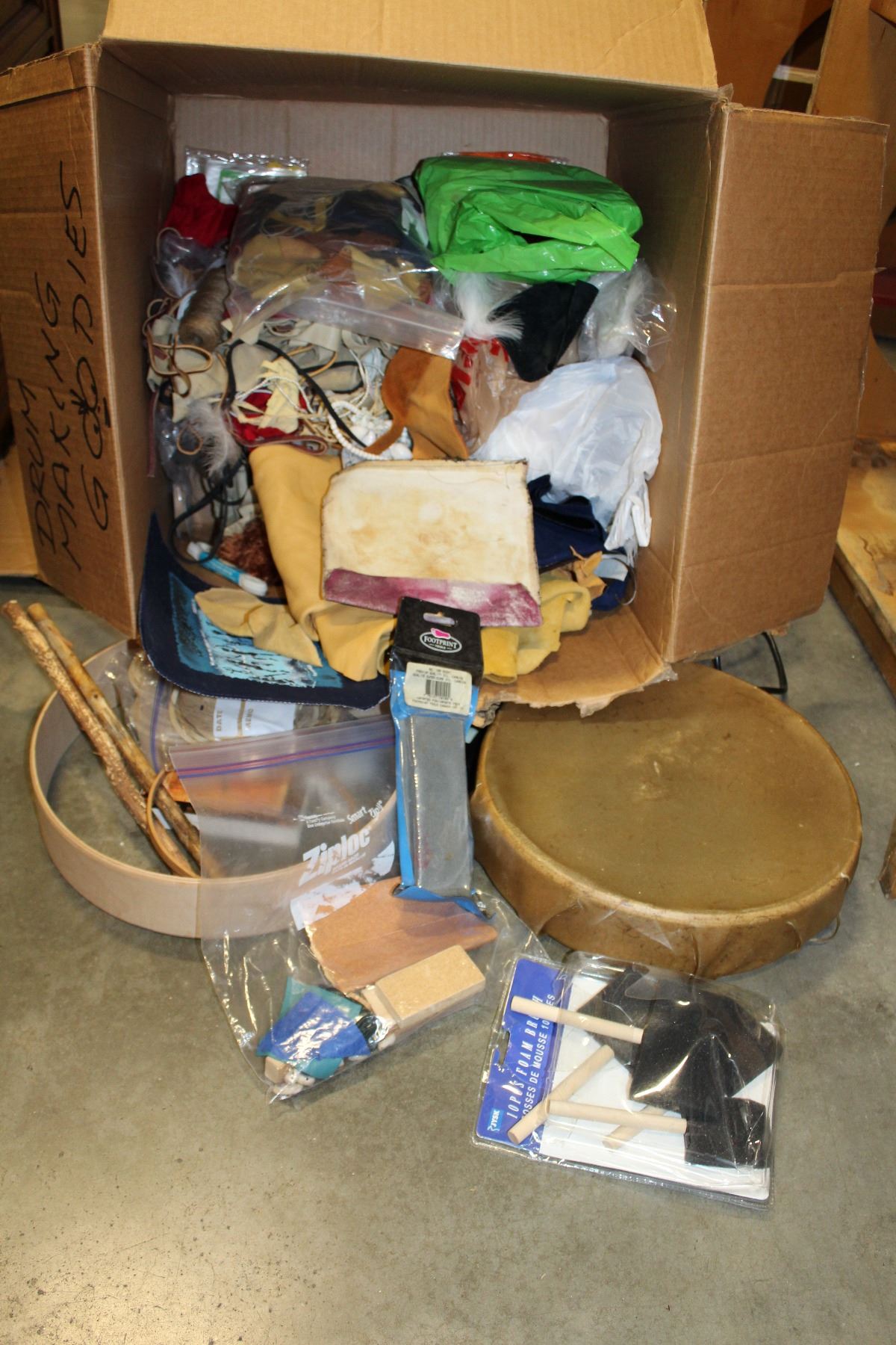 BOX OF FIRST NATIONS DRUM MAKING SUPPLIES AND DRUM
