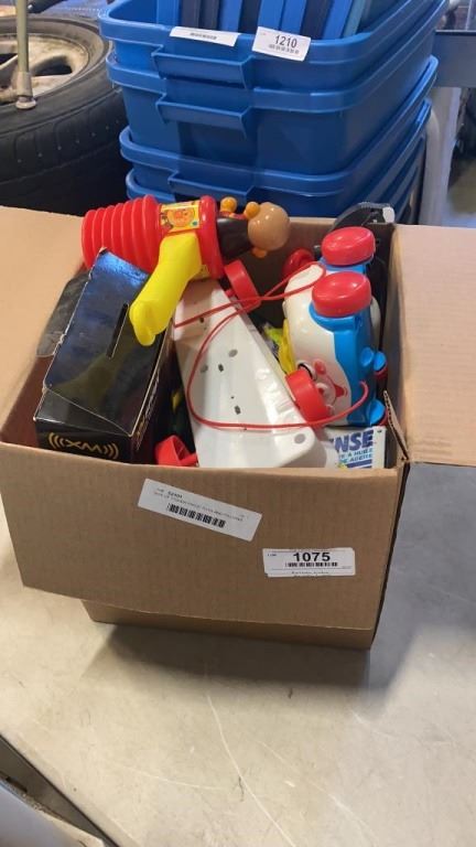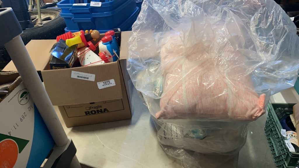 BOX OF FISHER PRICE TOYS AND PILLOWS
