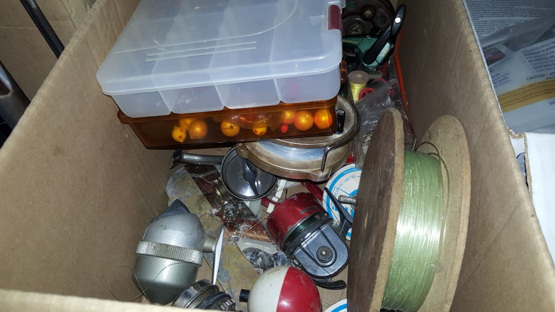 BOX OF FISHING REELS, LINE, AND ACCESSORIES