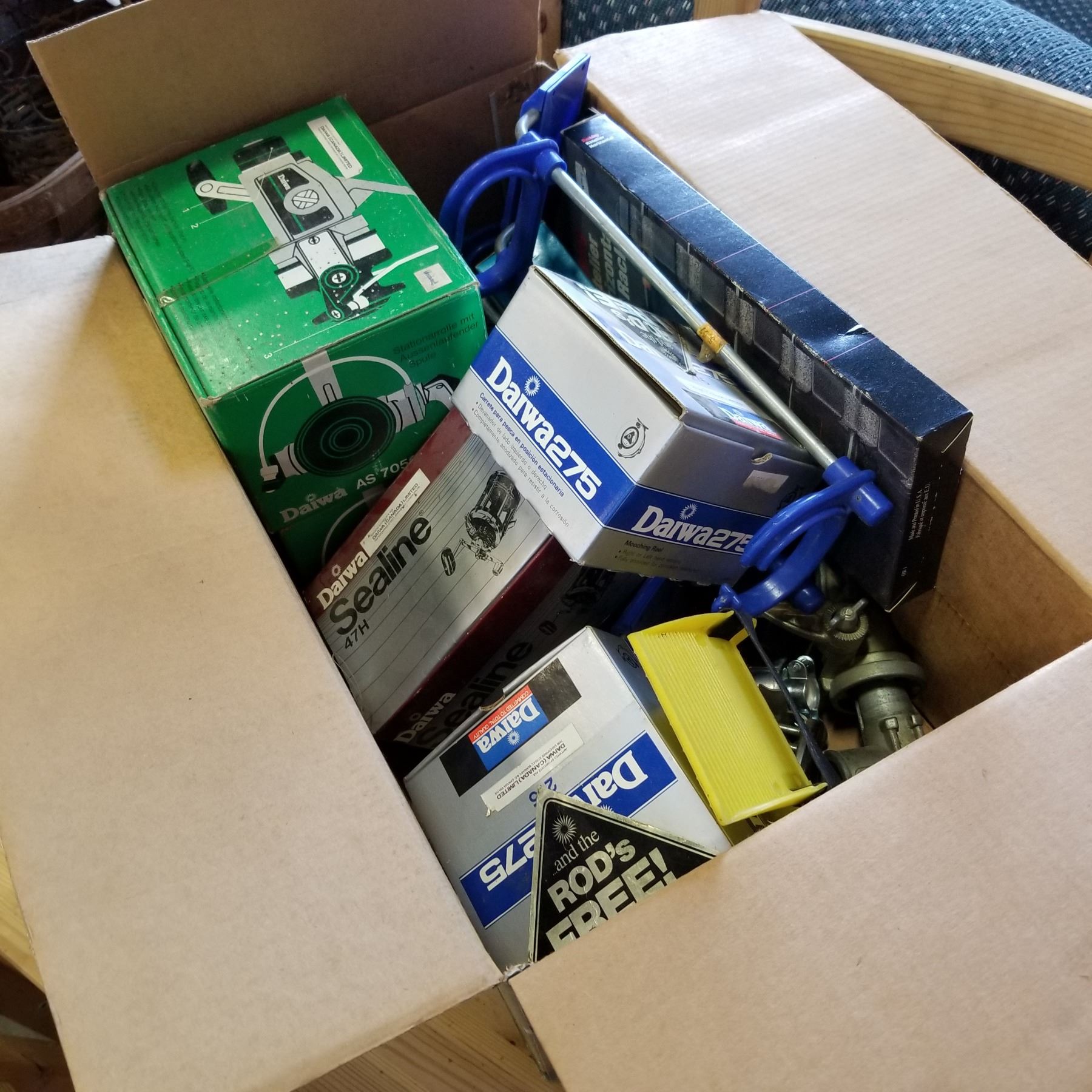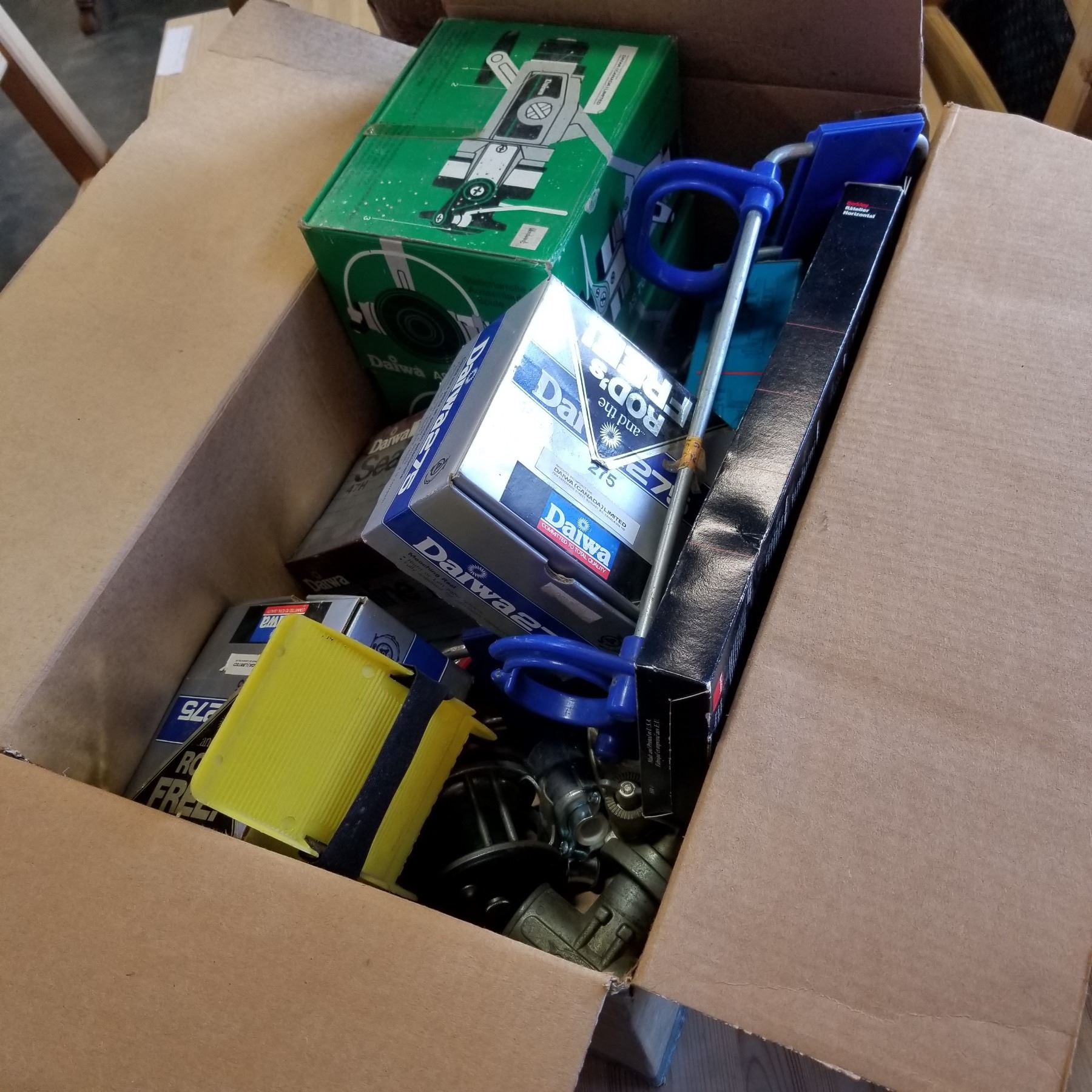 BOX OF FISHING REELS, SOME BOXED AND FISHING ITEMS