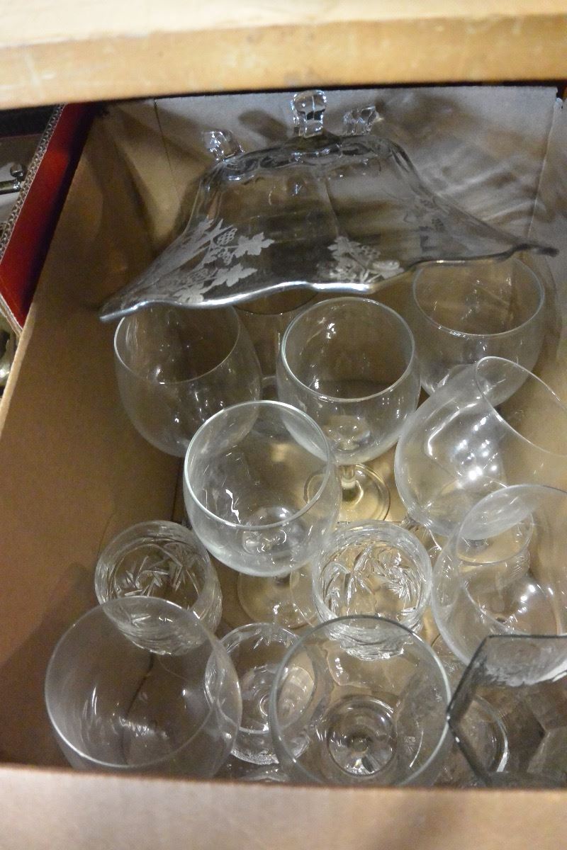 BOX OF GLASSWARE AND SILVER OVERLAY SERVING BOWL