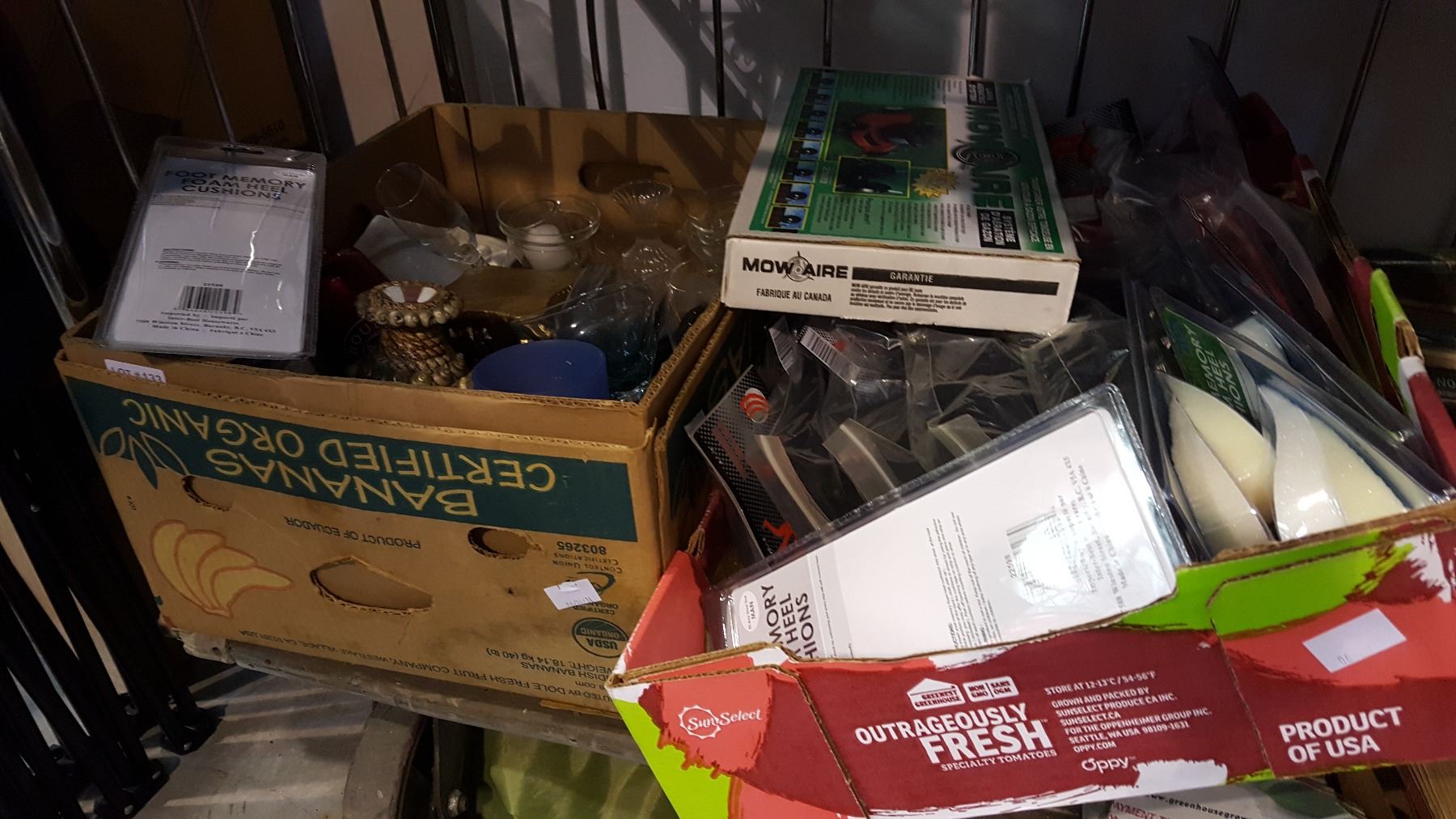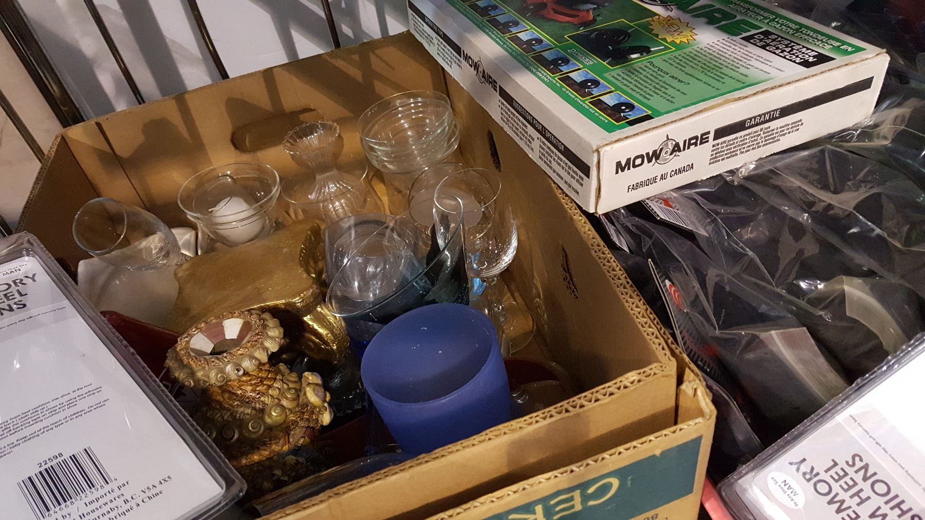 BOX OF GLASSWARE, SHINPADS, AND KNEE PADS