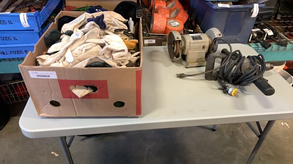 BOX OF GLOVES, BENCH GRINDER, DRILL