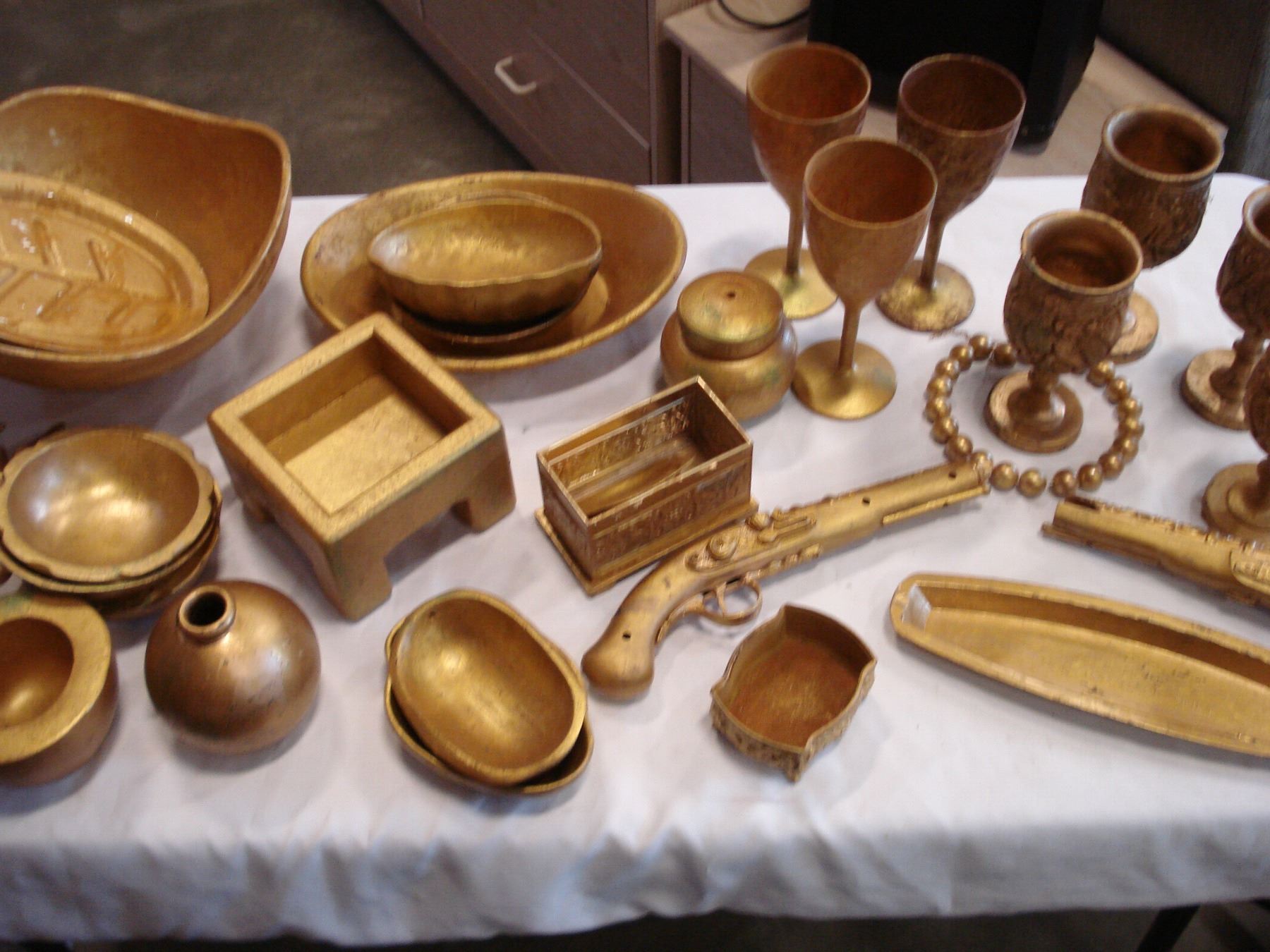BOX OF GOLD PAINTED DECORATIVE CUPS, FLINT LUCK PISTOLS, AND DECOR