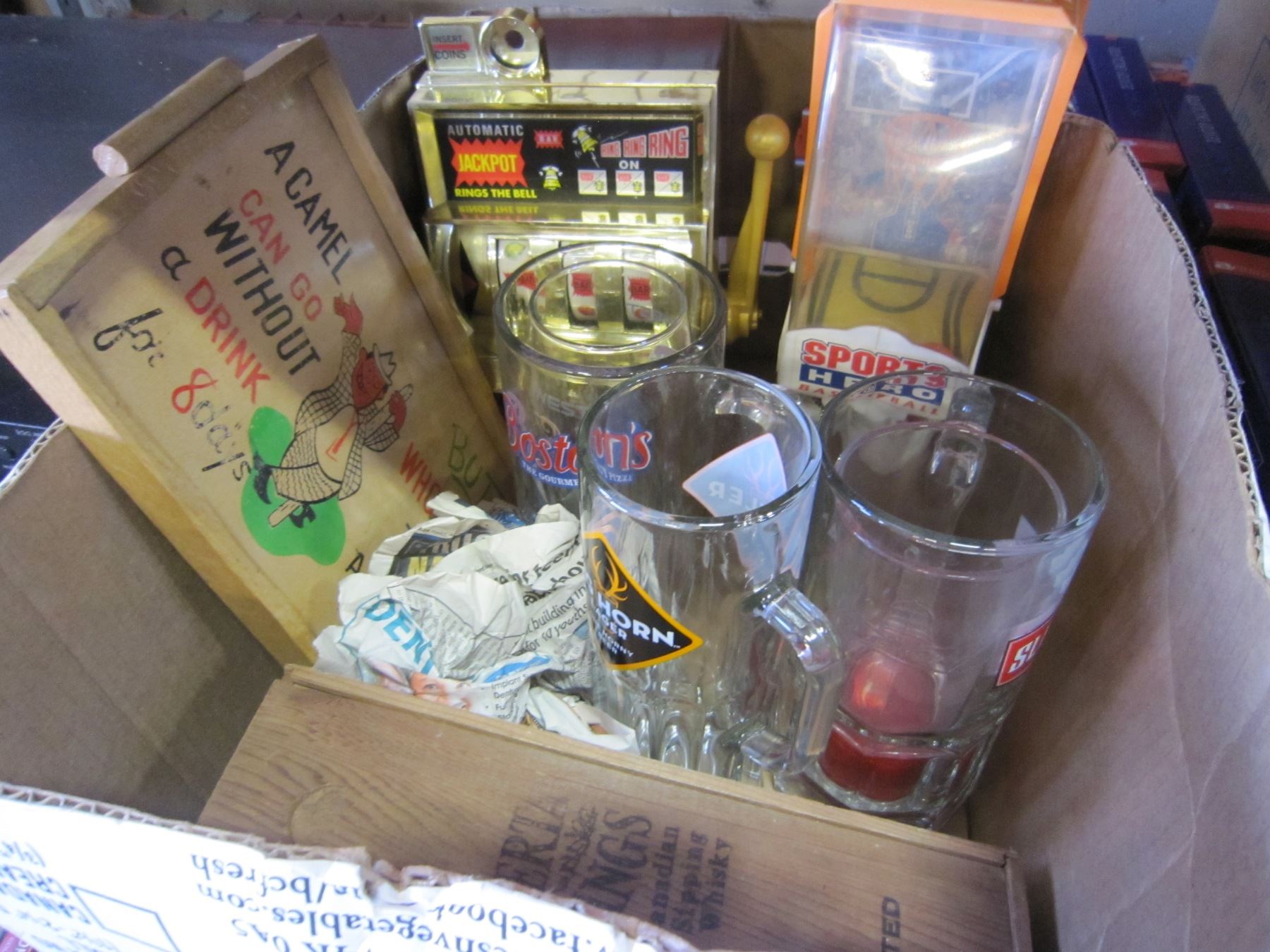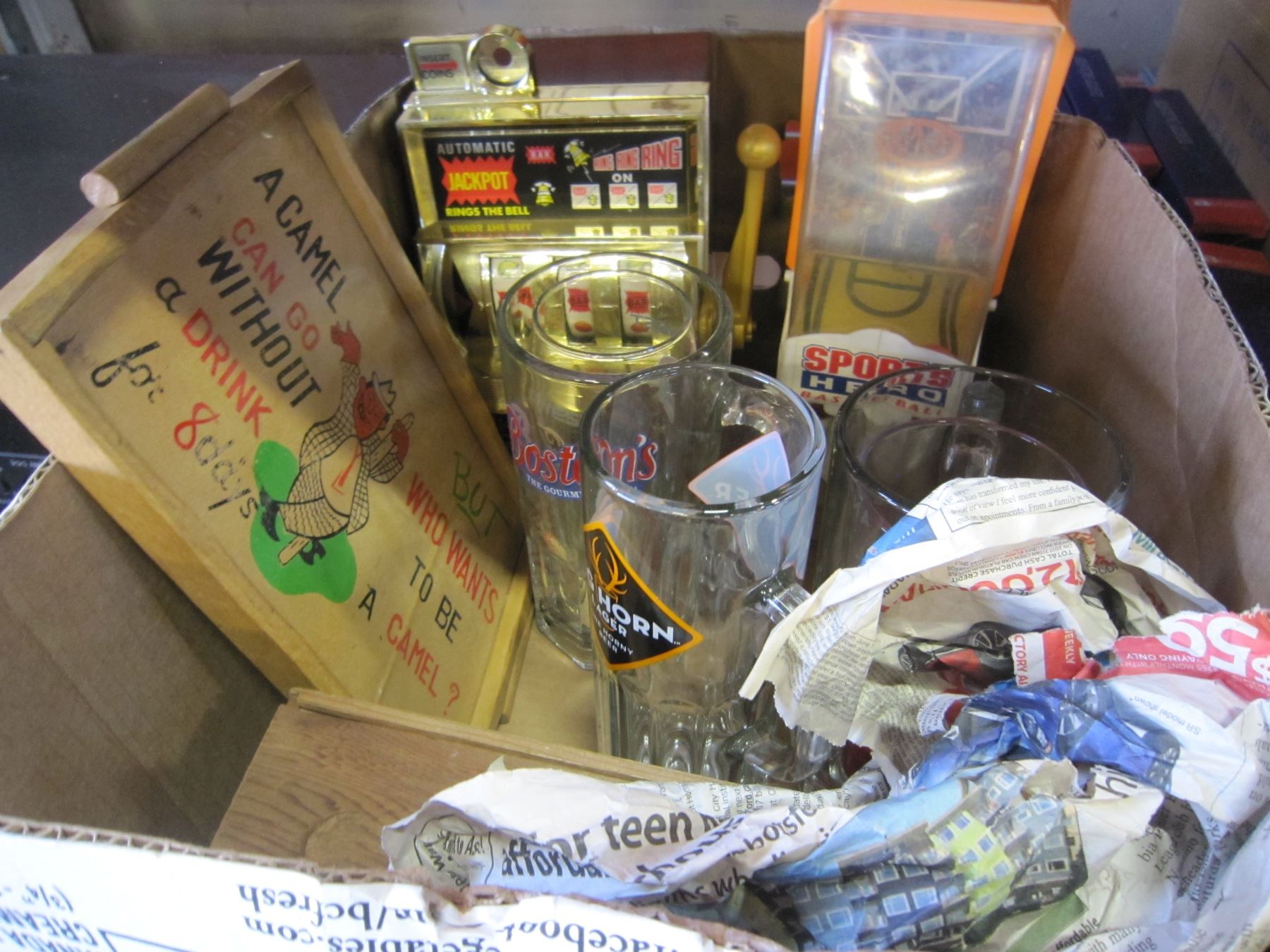 BOX OF GOLDEN JACKPOT MACHINE BASKETBALL GAME AND COLLECTOR MUGS