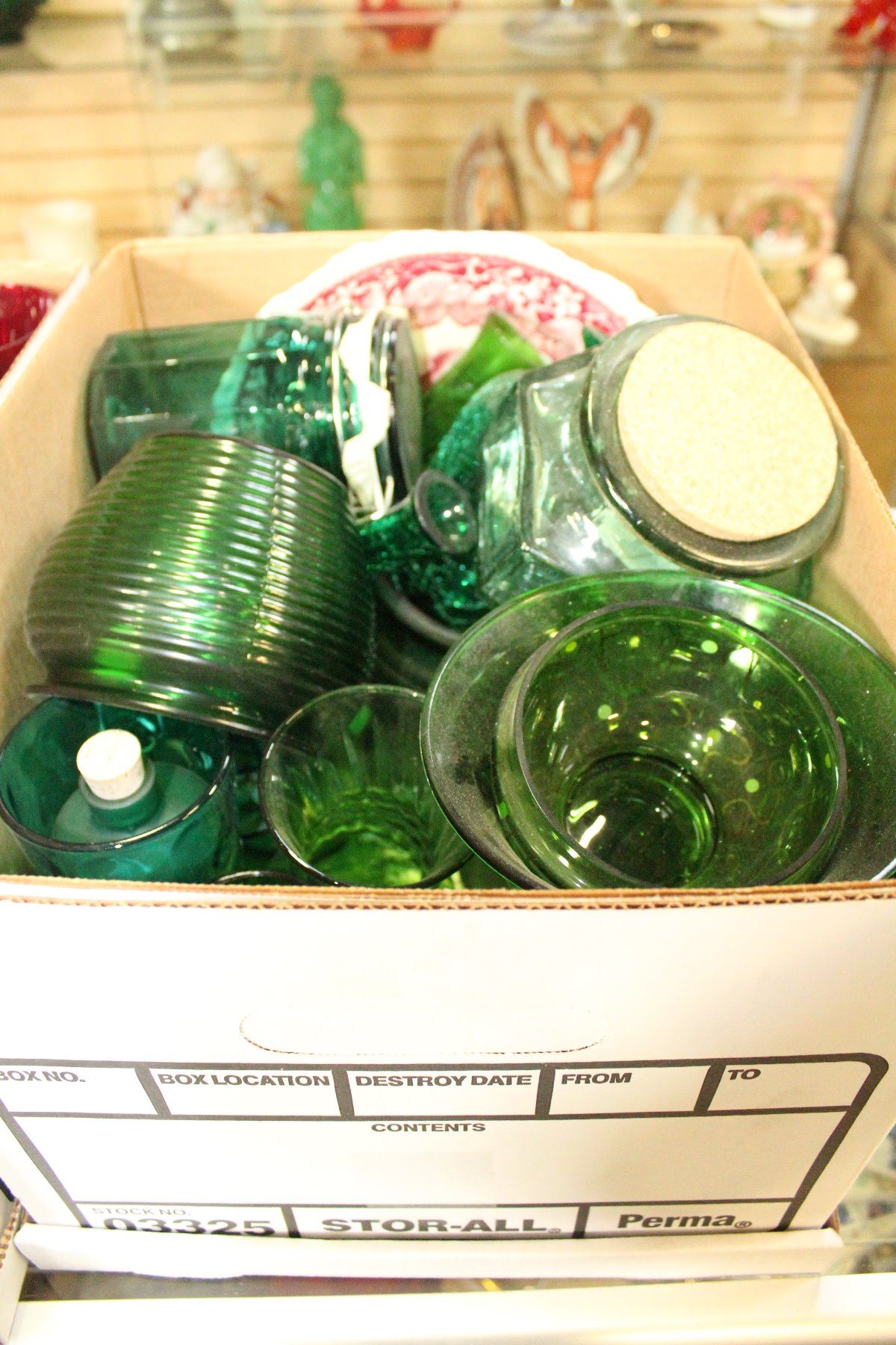 BOX OF GREEN GLASS VASES JARS AND GLASSES