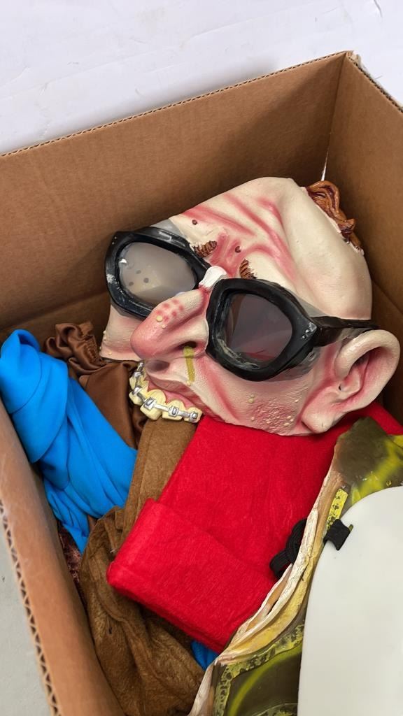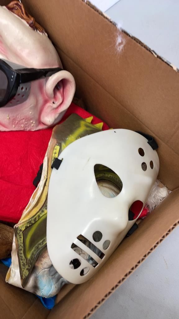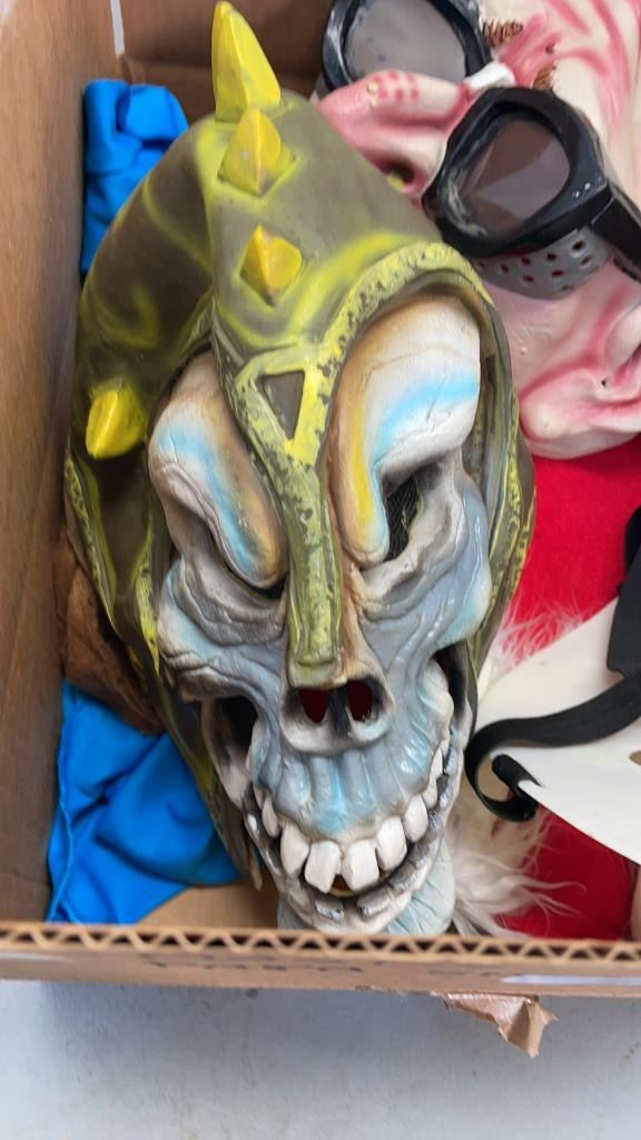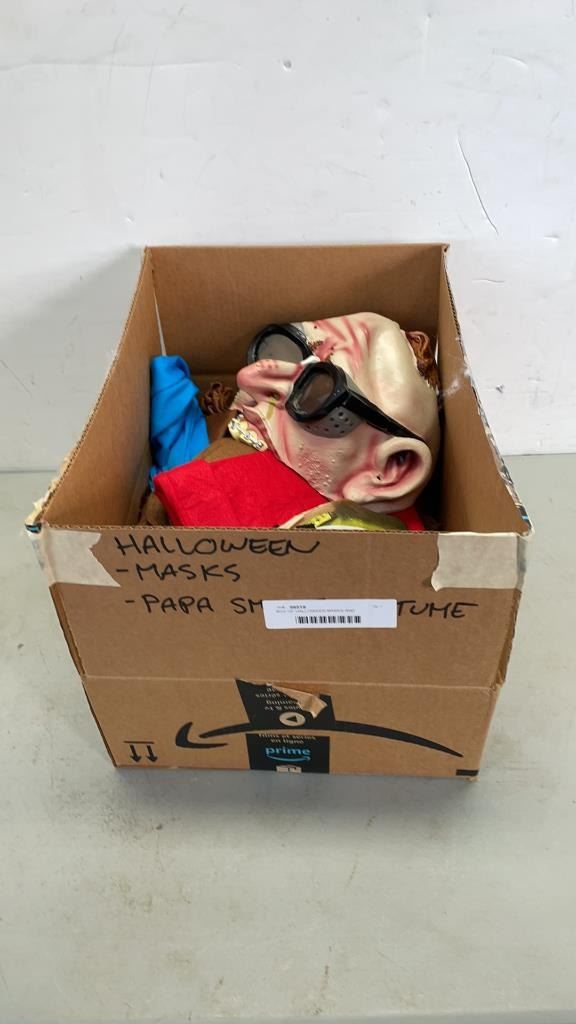 BOX OF HALLOWEEN MASKS AND PAPA SMURF COSTUME