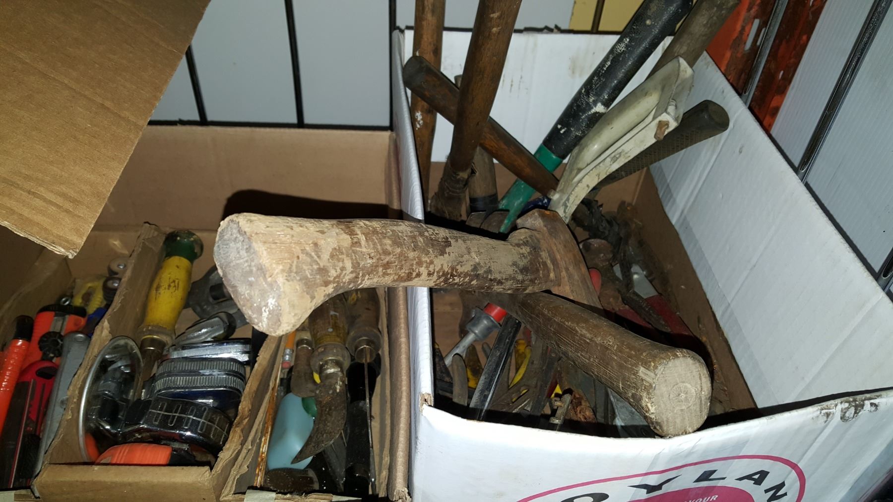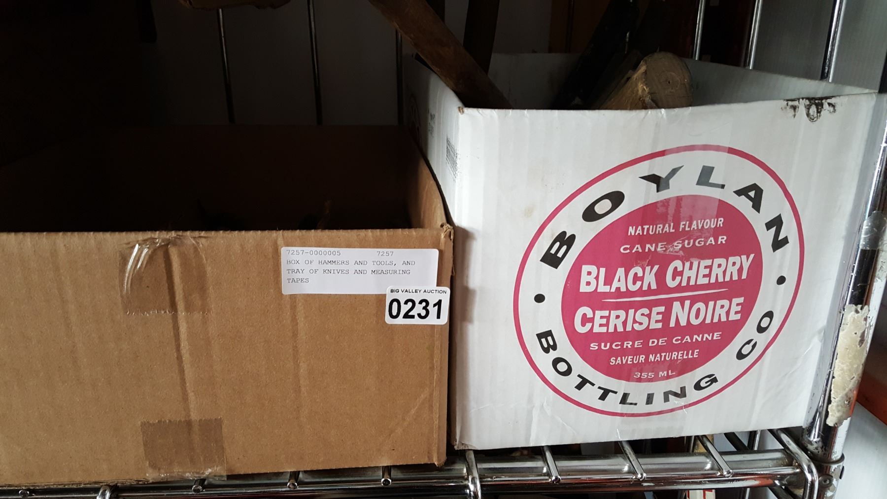 BOX OF HAMMERS AND TOOLS, AND TRAY OF KNIVES AND MEASURING TAPES