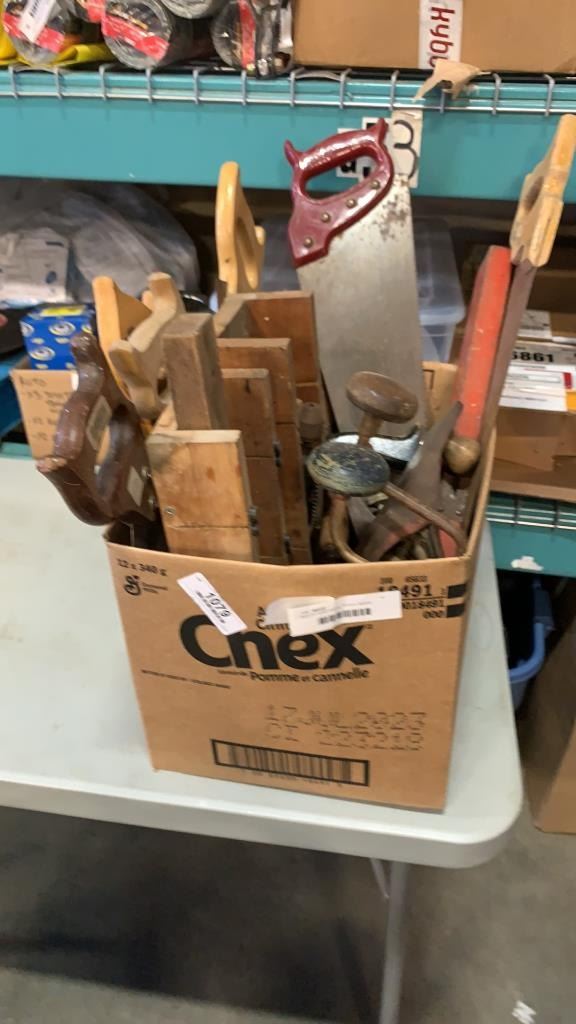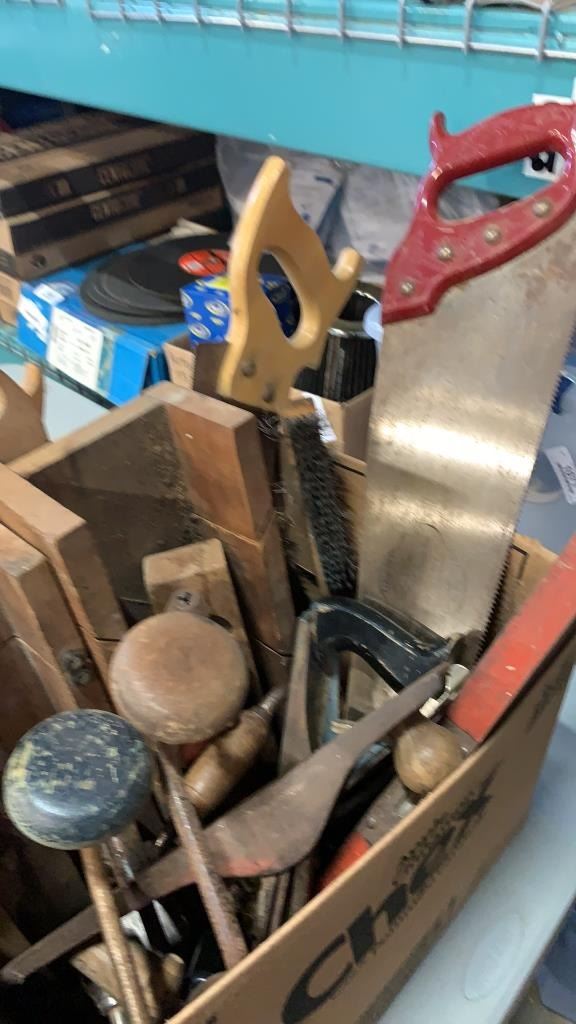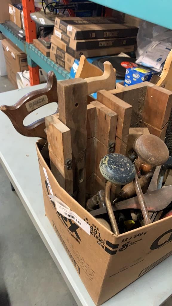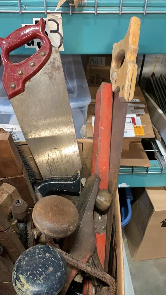 BOX OF HAND SAWS, TOOLS, WOOD PLANES, WIRE BRUSHES, LEVEL, HAND DRILLS