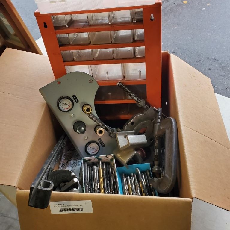 BOX OF HARDWARE ORGANIZER, DRILL BITS AND MORE
