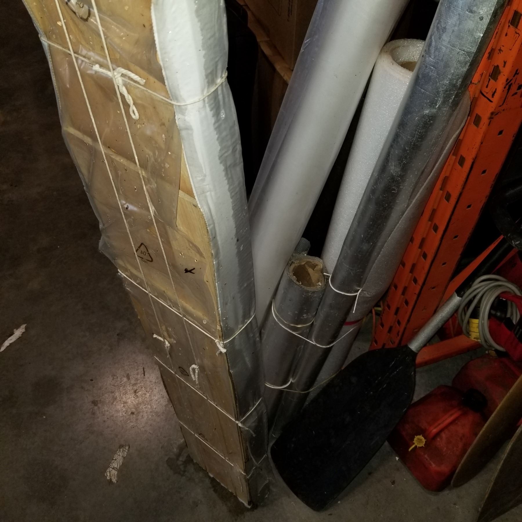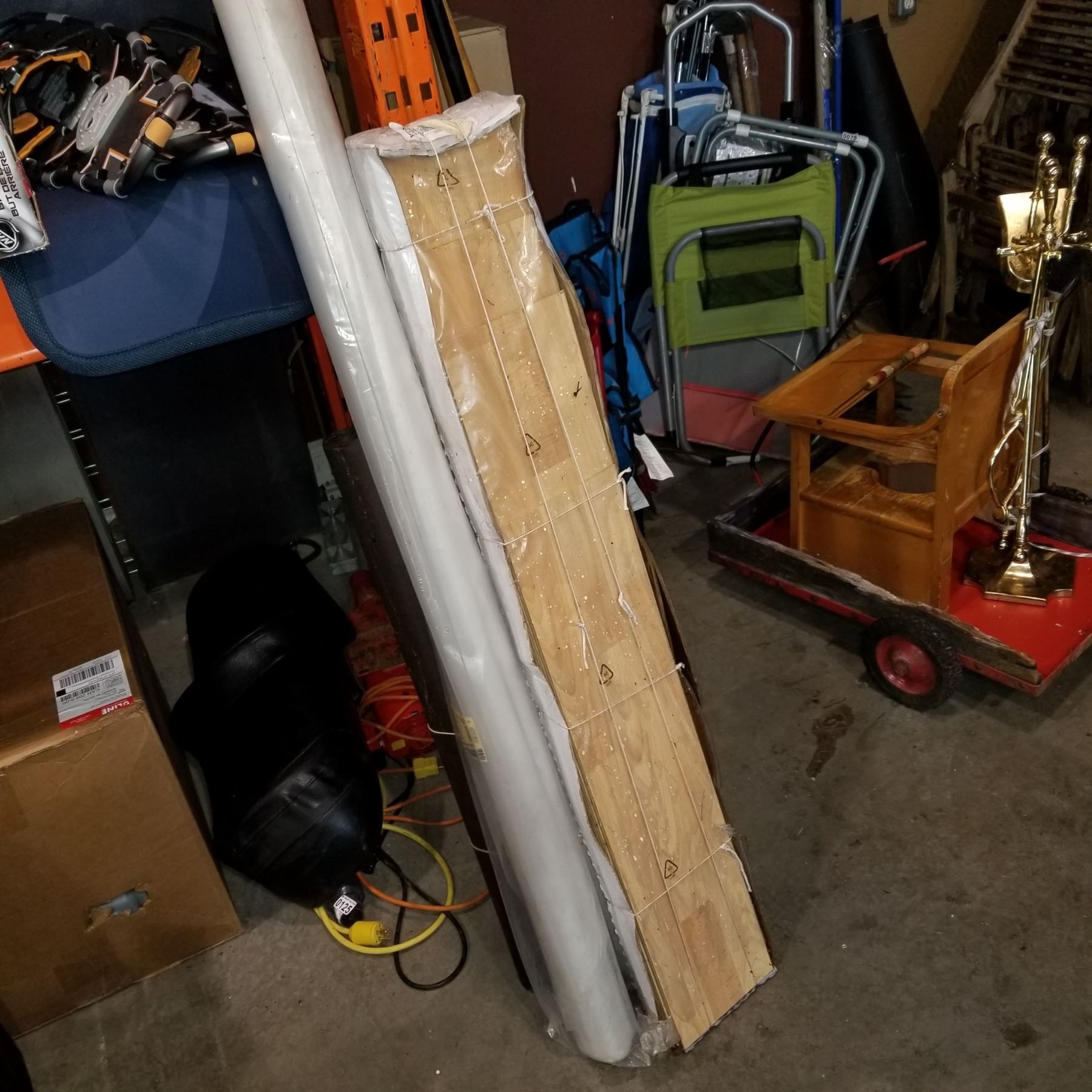 BOX OF HARDWOOD FLOORING, THE VAPOR BARRIER, AND OTHER VARIOUS ROLLS