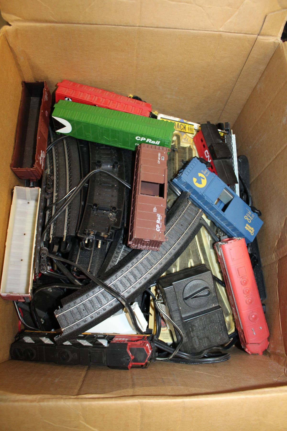 BOX OF HO SCALE TRAIN ENGINES, CARS, AND TRACKS