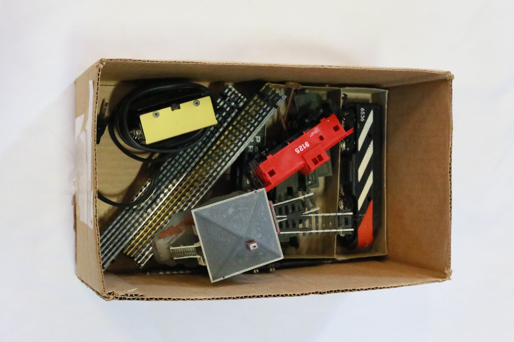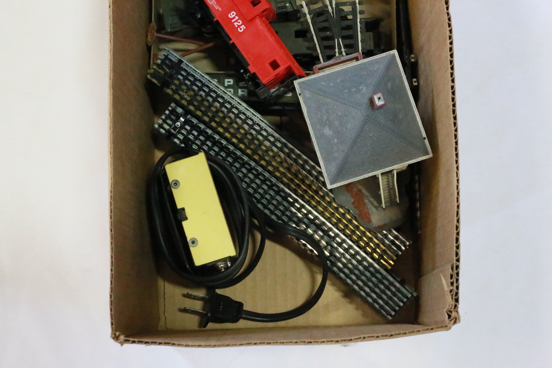 BOX OF HO SCALE TRAINS AND BOX CARS CONTROLLER AND TRACK