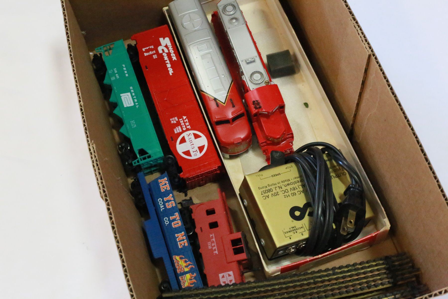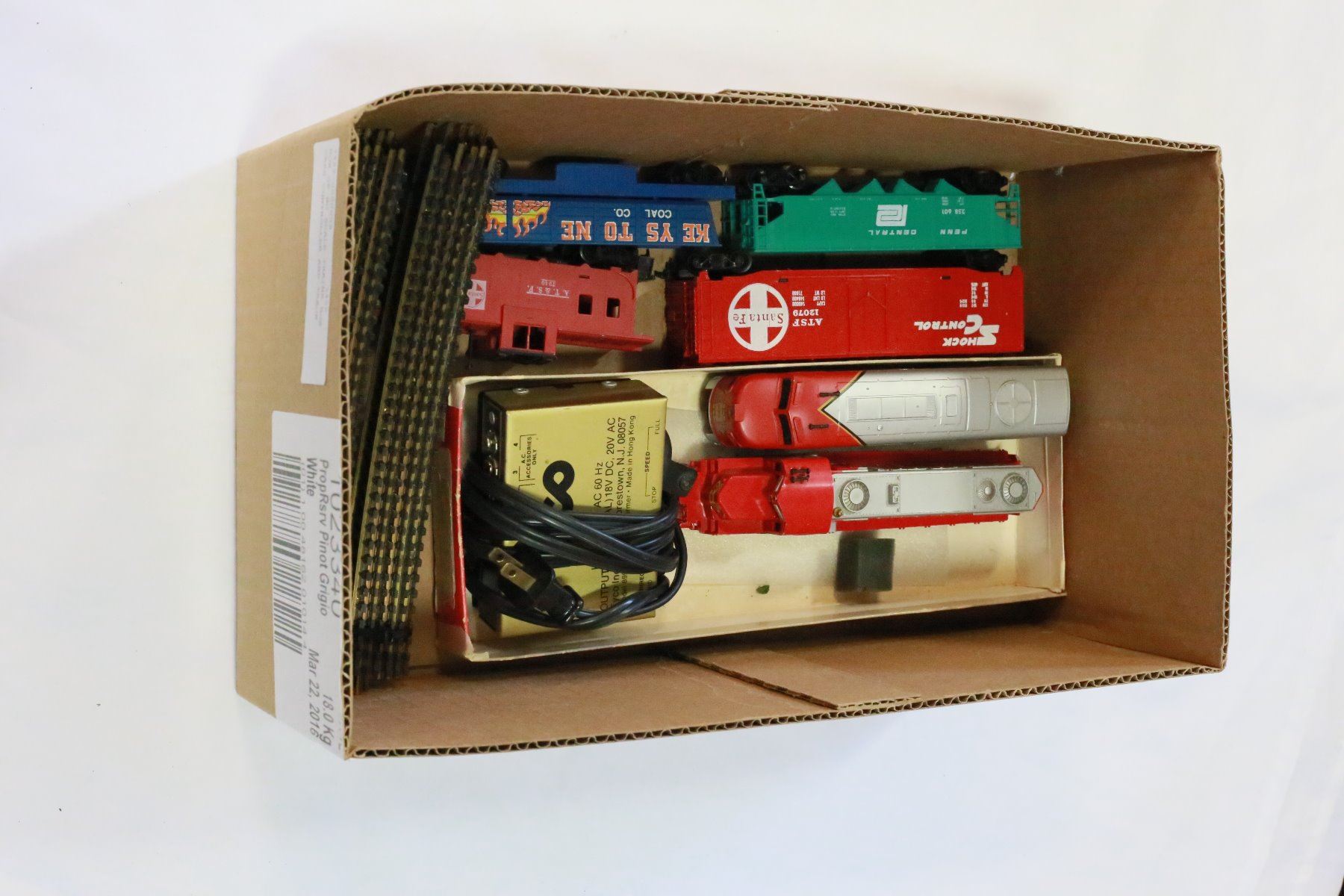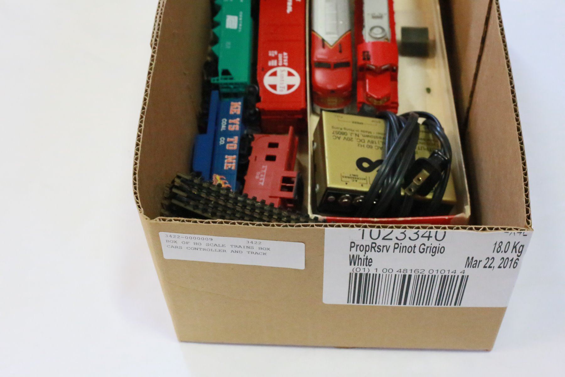 BOX OF HO SCALE TRAINS BOX CARS CONTROLLER AND TRACK