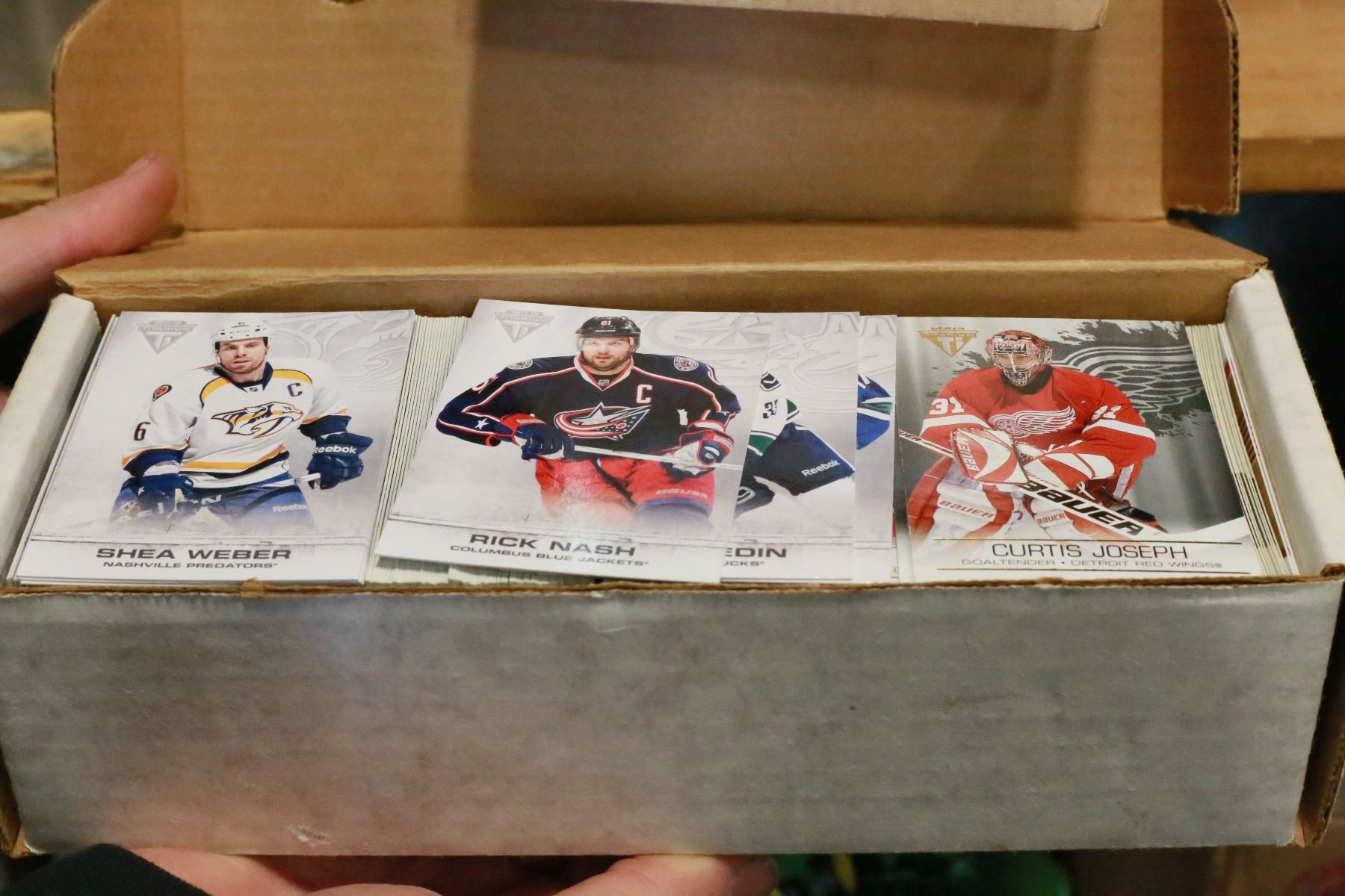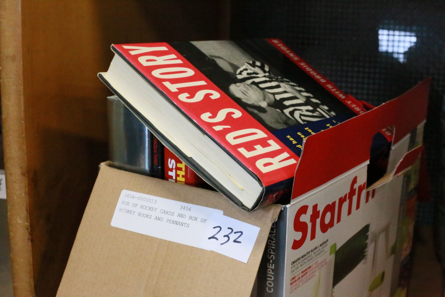 BOX OF HOCKEY CARDS AND BOX OF HCOKEY BOOKS AND PENNANTS
