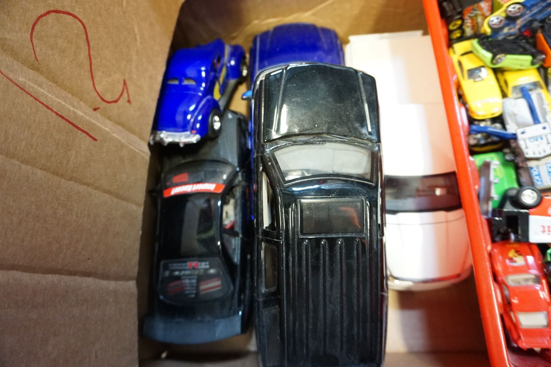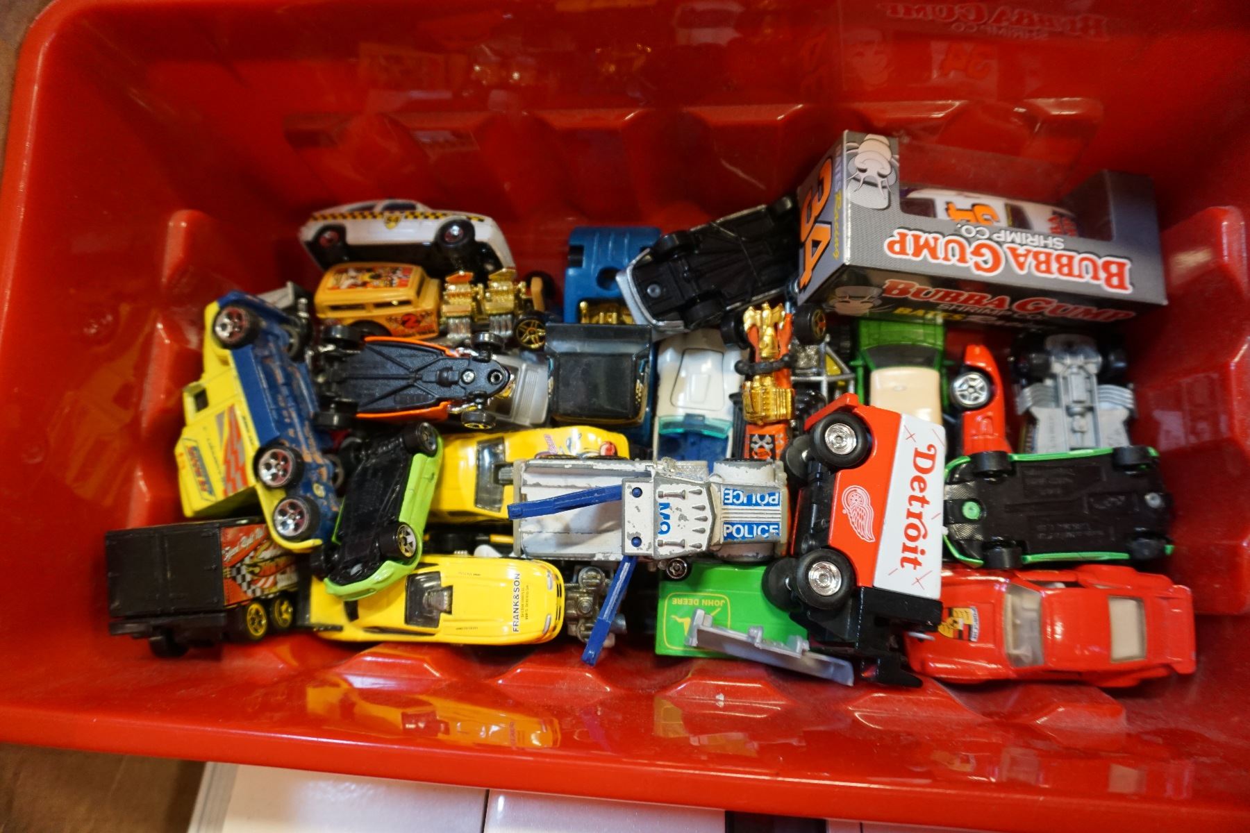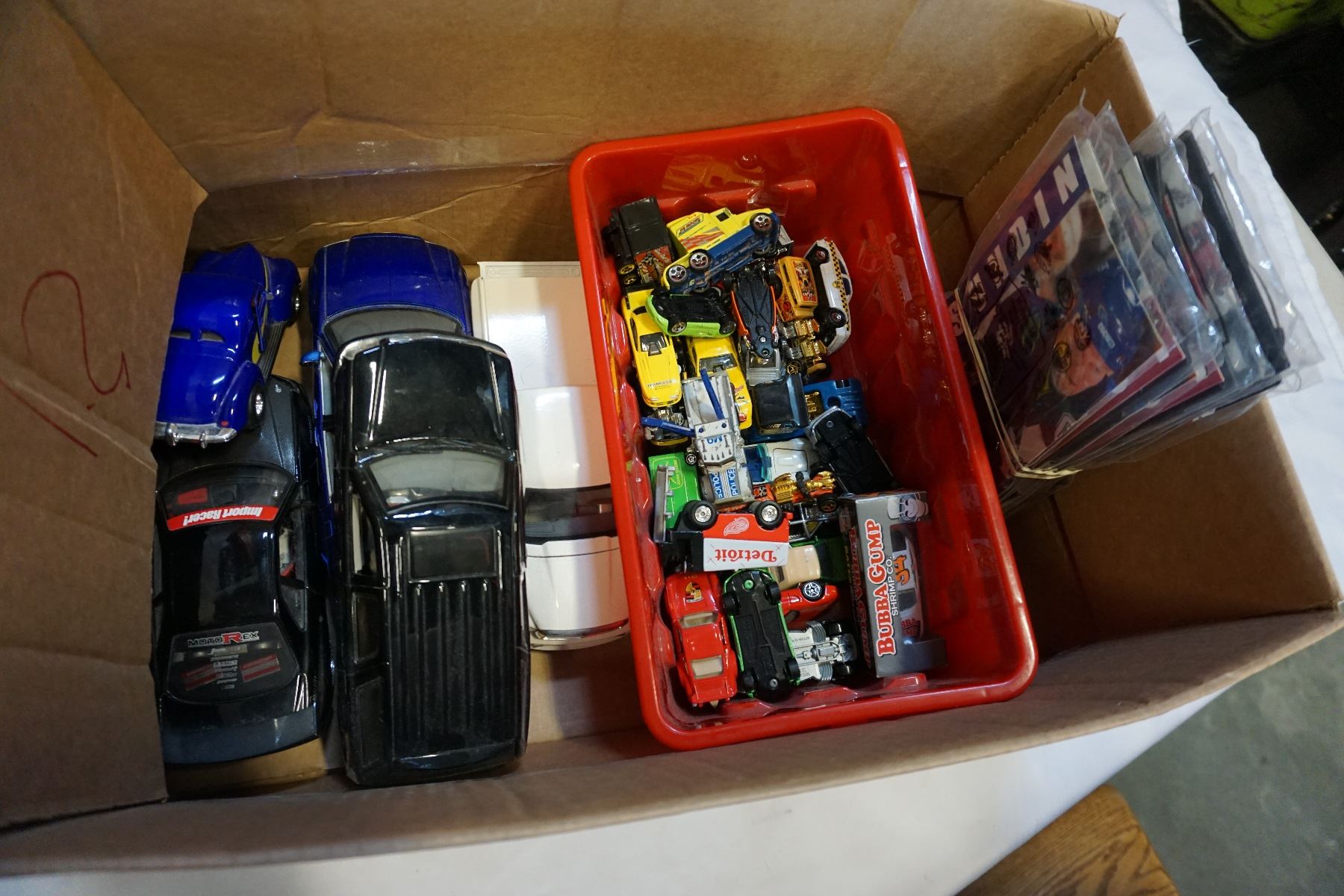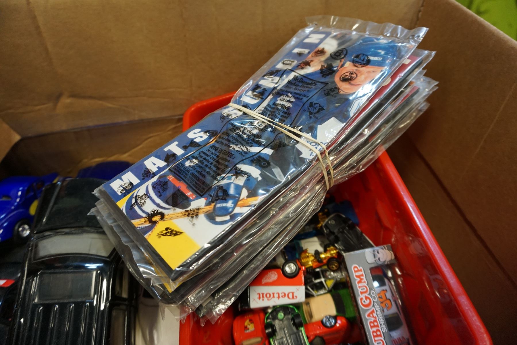 BOX OF HOTWHEELS AND DIE CAST CARS AND MINI HOCKEY JERSEYS