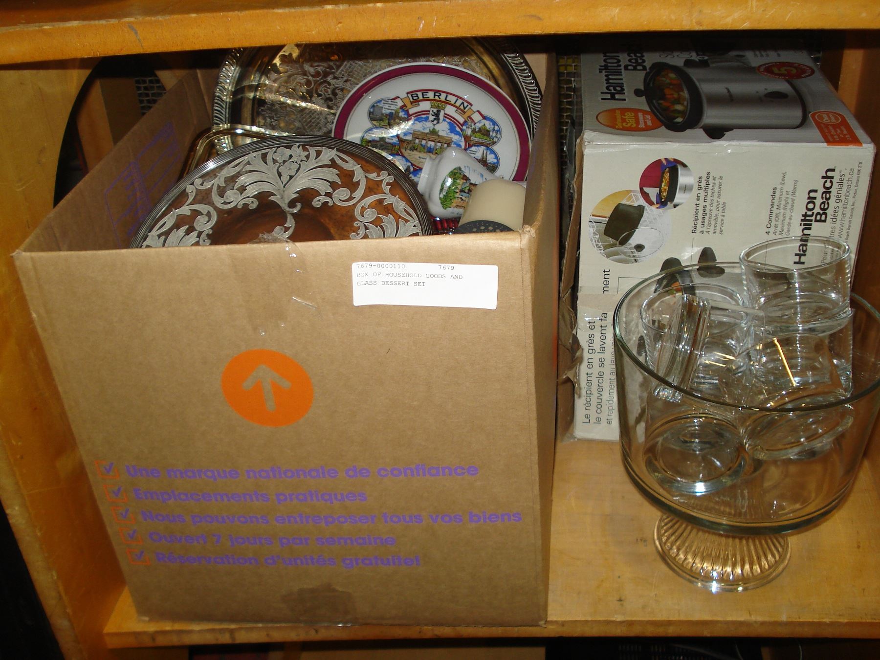BOX OF HOUSEHOLD GOODS AND GLASS DESSERT SET
