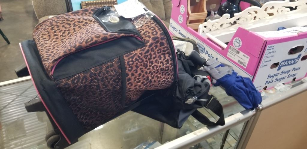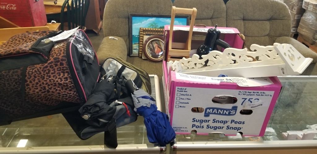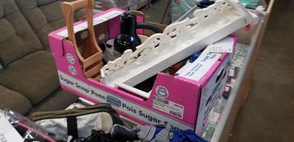 BOX OF HOUSEHOLD ITEMS, INCLUDING LIGHT, SHELF, ETC AND BAGS, ROLLING COOLER BAG ETC