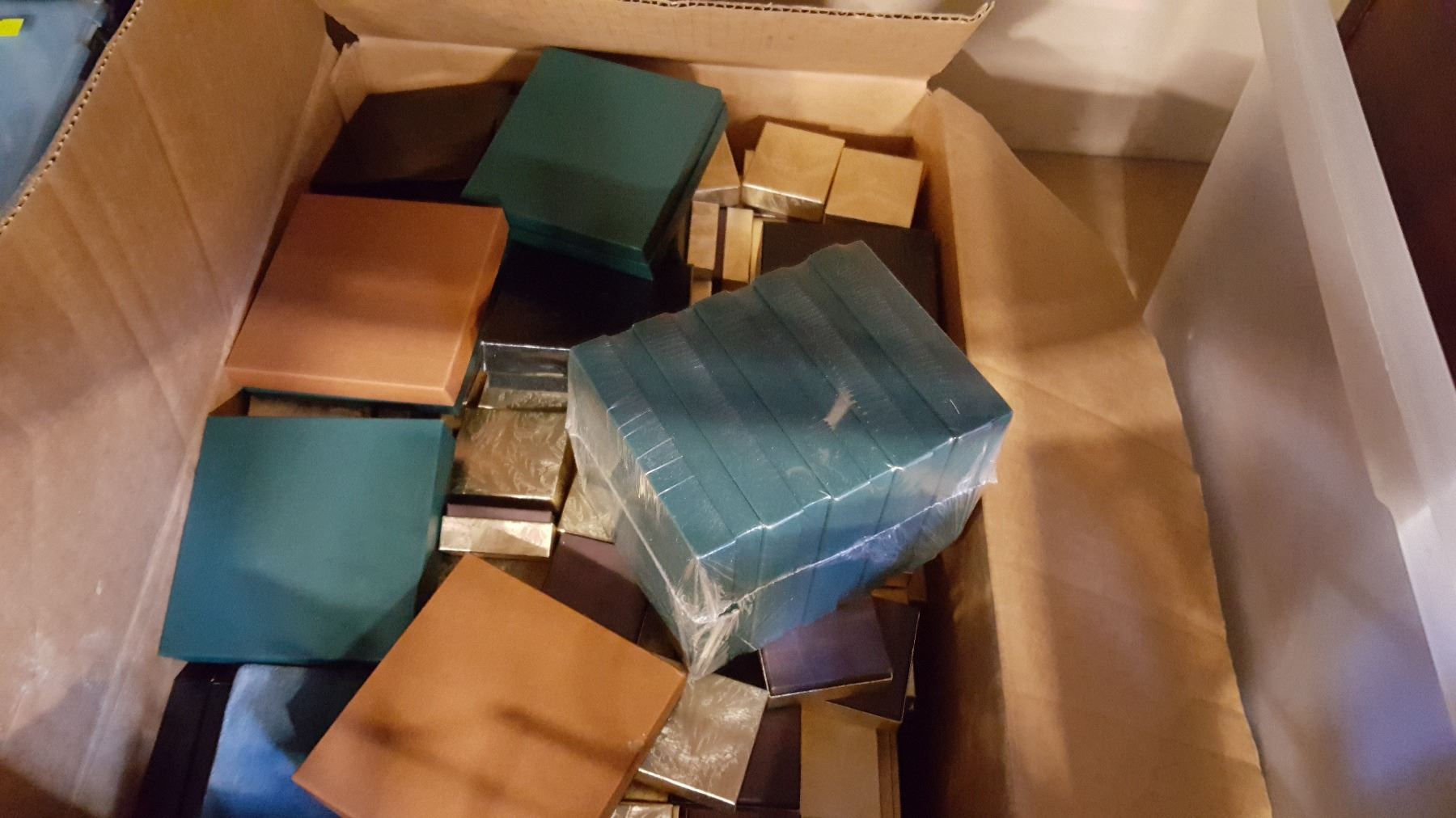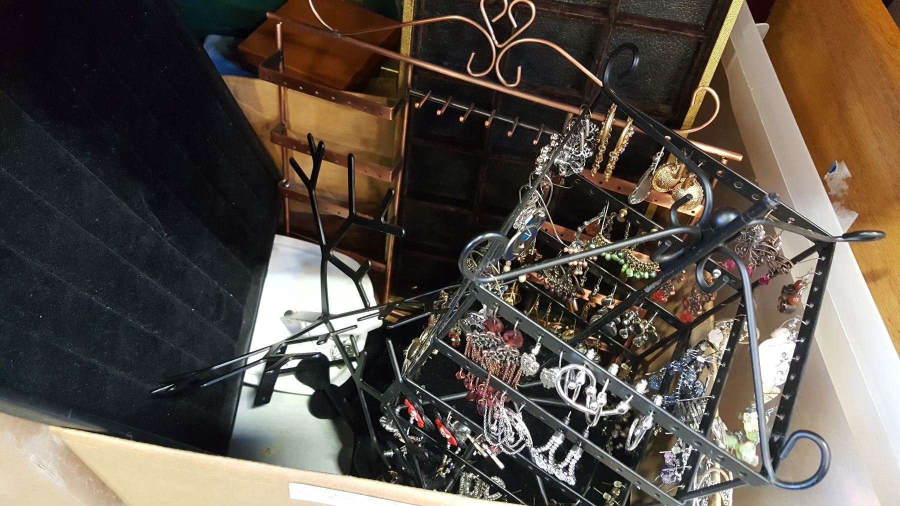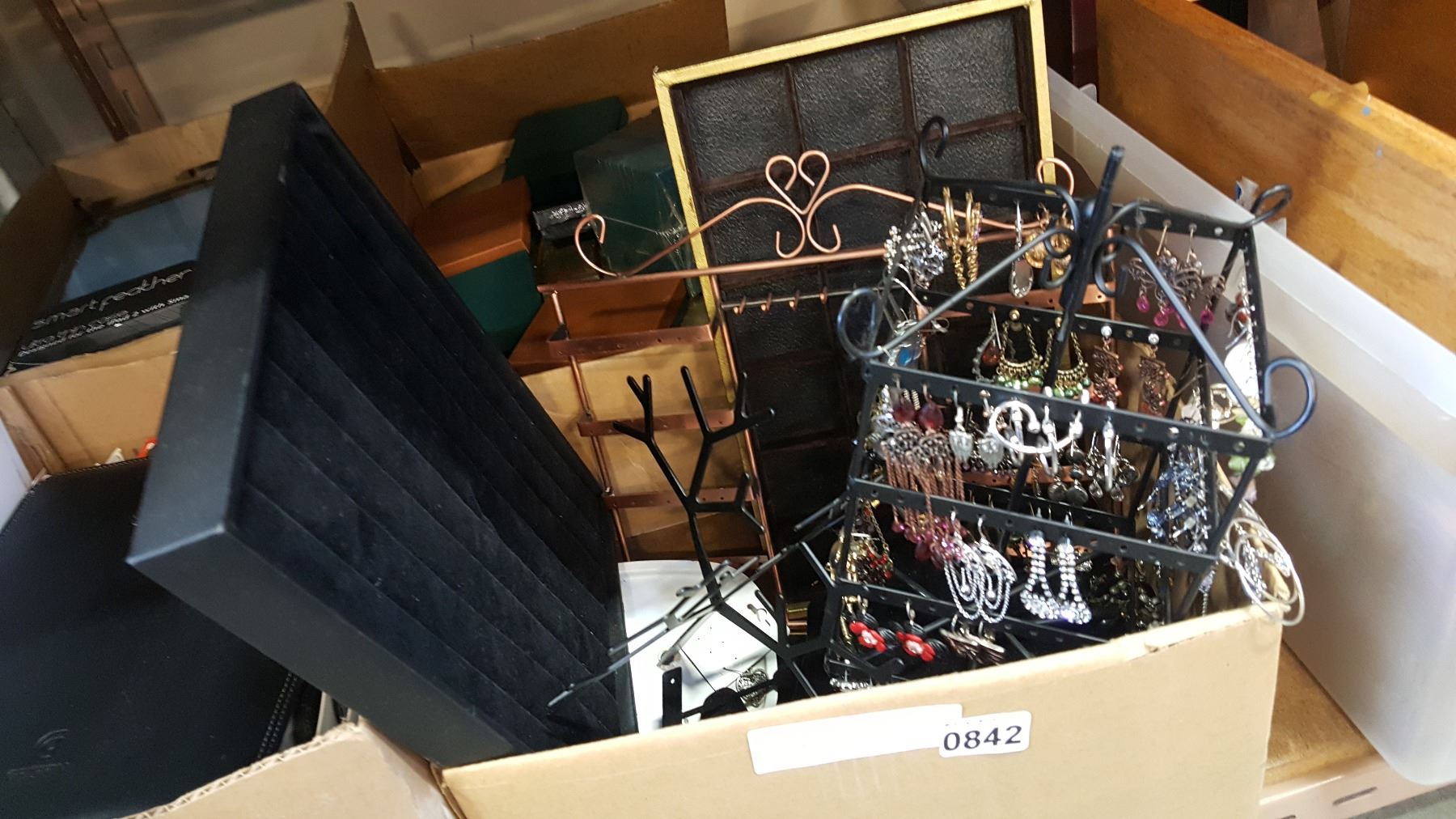 BOX OF JEWELLRY ON STANDS AND EMPTY JEWELLRY BOXES