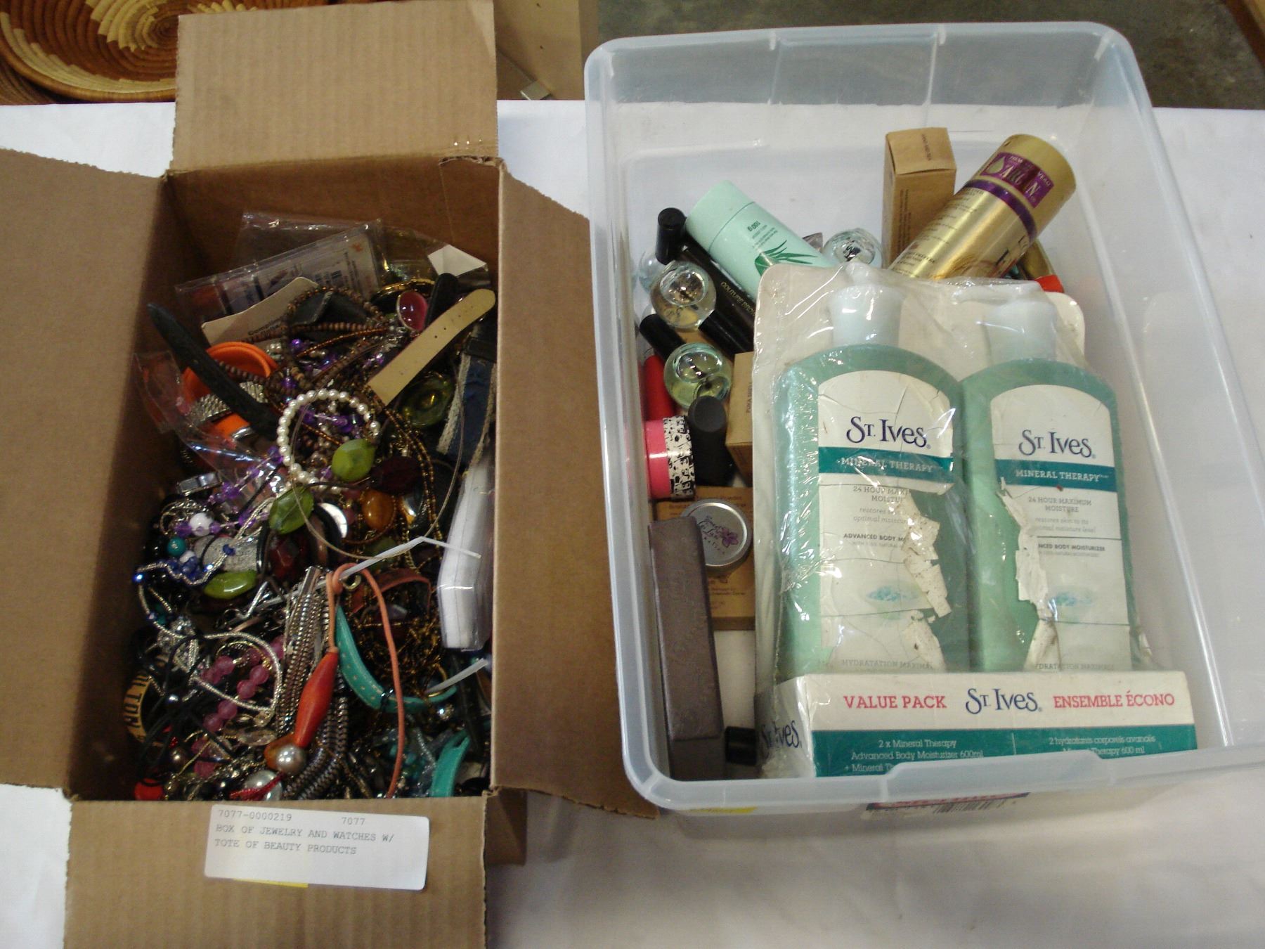 BOX OF JEWELRY AND WATCHES W/ TOTE OF BEAUTY PRODUCTS